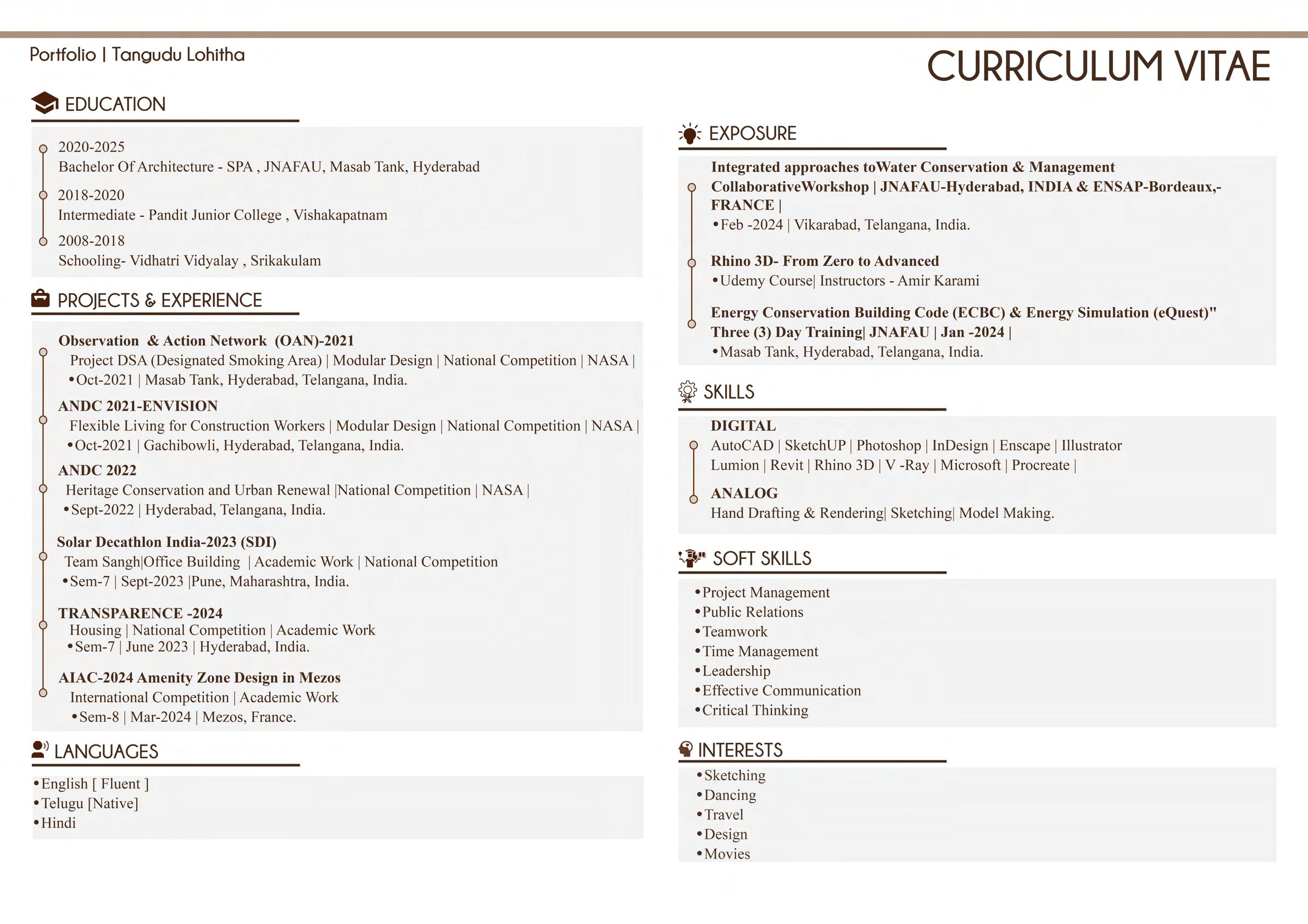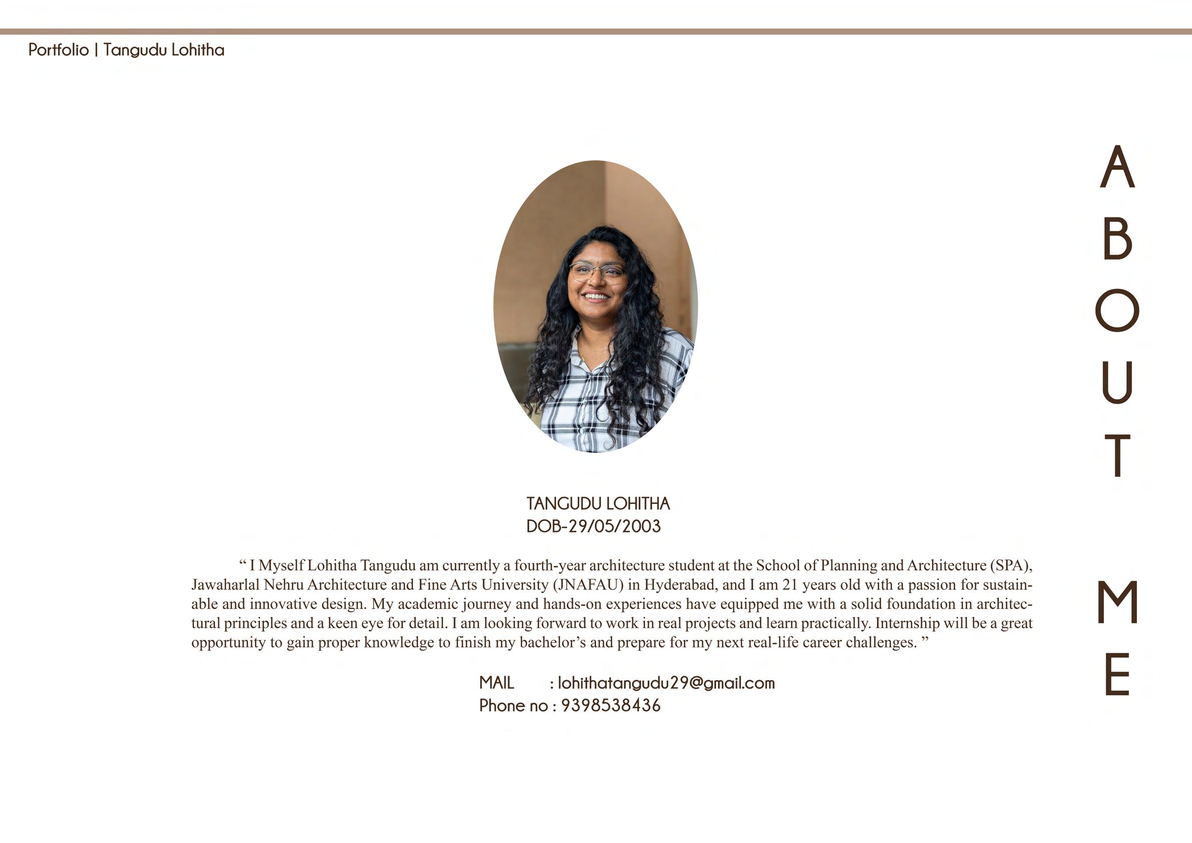 I am Lohitha pursuing Bachelor of Architecture from SPA, JNAFAU ,Hyderabad .This portfolio, which highlights a wide variety of projects that demonstrate my developing design philosophy and technical proficiency, captures my architectural journey from 2020 to 2024. I have worked hard over the years to create environments that inspire and engage by fusing creativity with functionality, sustainability, and cultural sensitivity.