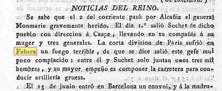 El 13 de julio de 1813 Suchet se halla en Fabara, con la intención de recoger noticias, en retirada desde Caspe a Gandesa. (Pedro Arnaldos Gimeno, 1987)
