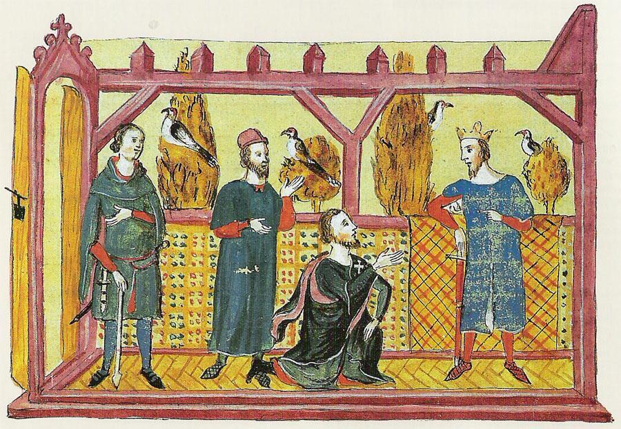Un sirviente, Blasco I d'Alagón y Hugo de Folcalquier (arrodillado) proponen la Conquista de Valencia al rey Jaime I de Aragón, en una miniatura del Llibre dels fets. (Wikipedia)