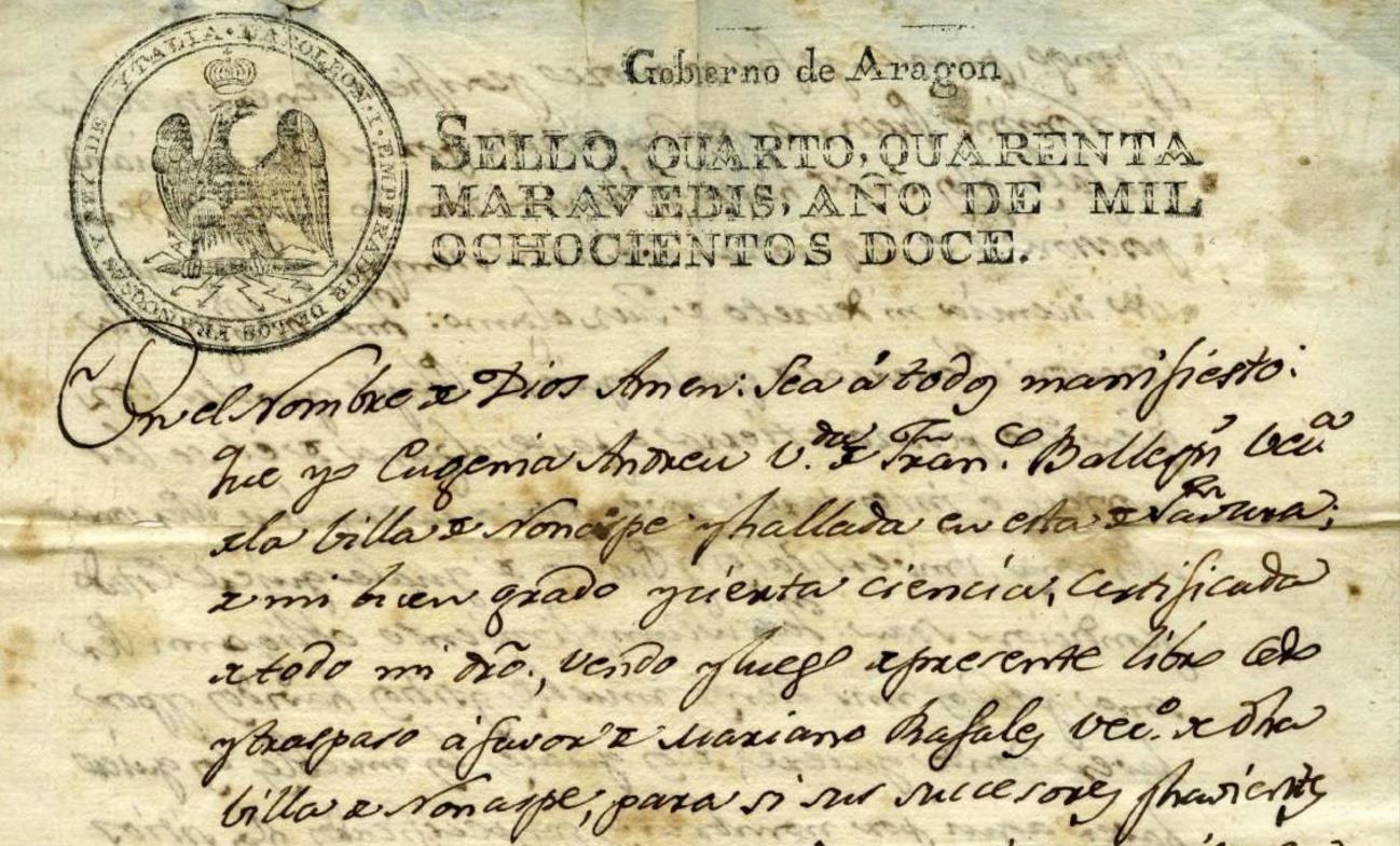 Documento cedido por Mario Rius de Nonaspe en el que se aprecia el escudo napoleónico (1812) y la firma del notario fabarol Antonio Millán casado con María Susana Doménec.