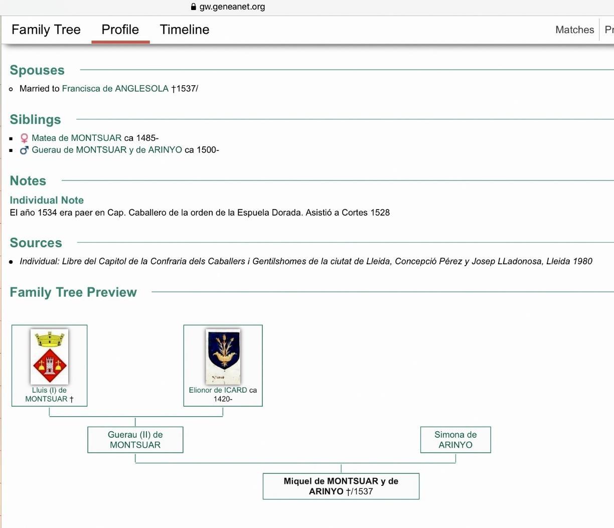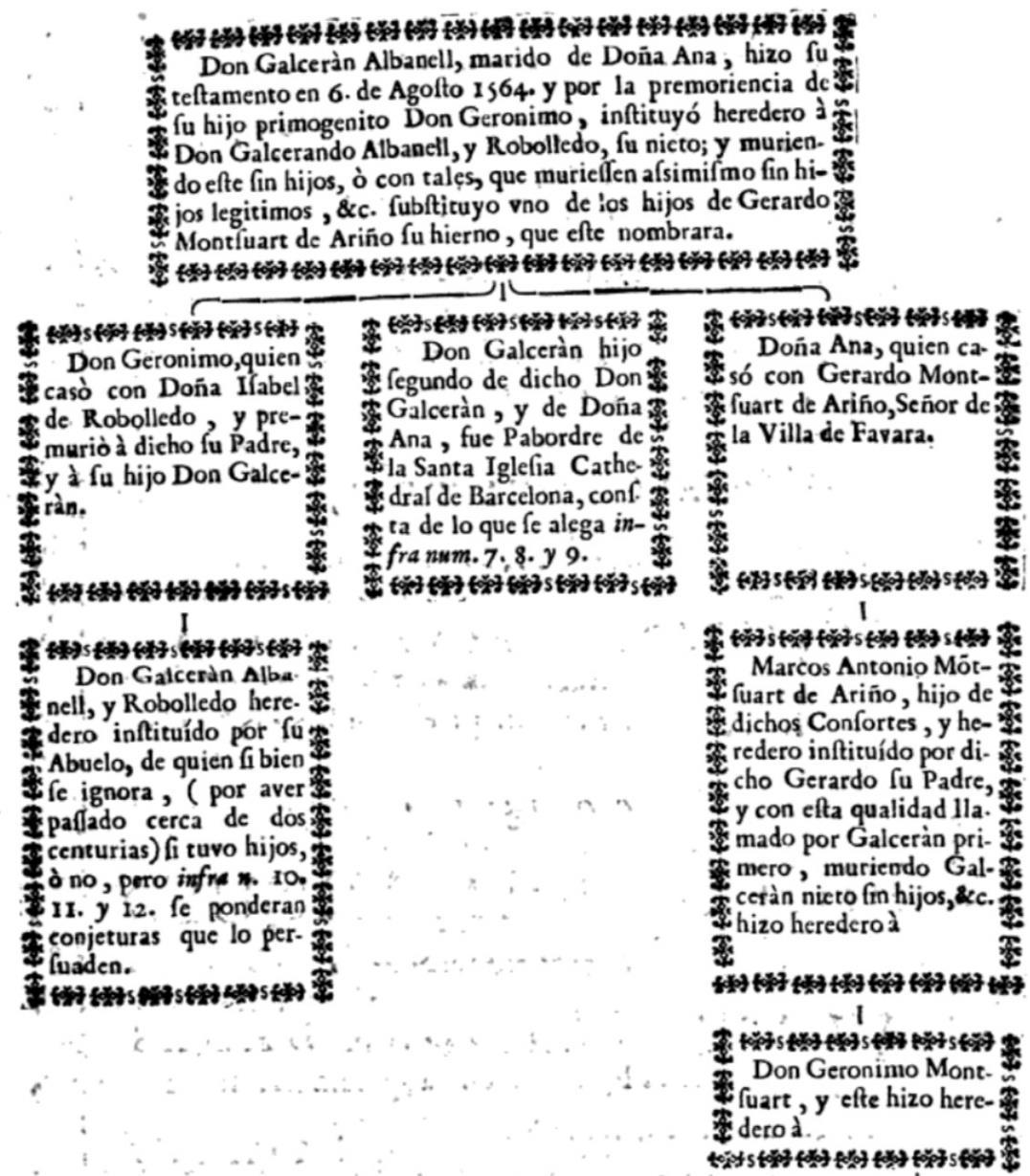 Orden de Calatrava -Blasco de Alagón-Constanza de Alagón/Guillem de Anglesola-Ximen Pérez de Pina-– Sessé Francisco de Ariño (Secretario de Alfonso V, ☨29-12-1429) - Úrsula de Ariño (☨1459) (su hijo) Manuel de Ariño (Concordia 1437-1444, ☨1451); Juan Francisco de Ariño (su hijo) (hermano de Manuel) 1454, por compra a su sobrino, Francisco de Ariño – Isabel Clavero (hija de Francisco II e Isabel Clavero) Simona de Ariño – Guerau de Monsuar (señor de Torregrossa, ☨1514) (hijo de Simona) Miguel Montsuar de Ariño (☨1537) – Francisca de Argensola (☨1557) (hijo de Miguel) Guerau de Monsuar de Ariño (☨29-9-1588) – Ana Albanell i d’Almogàver (Concordias: 1539 y 1565) (Casa de Austria)