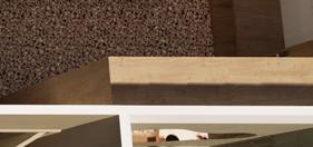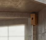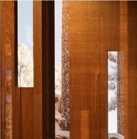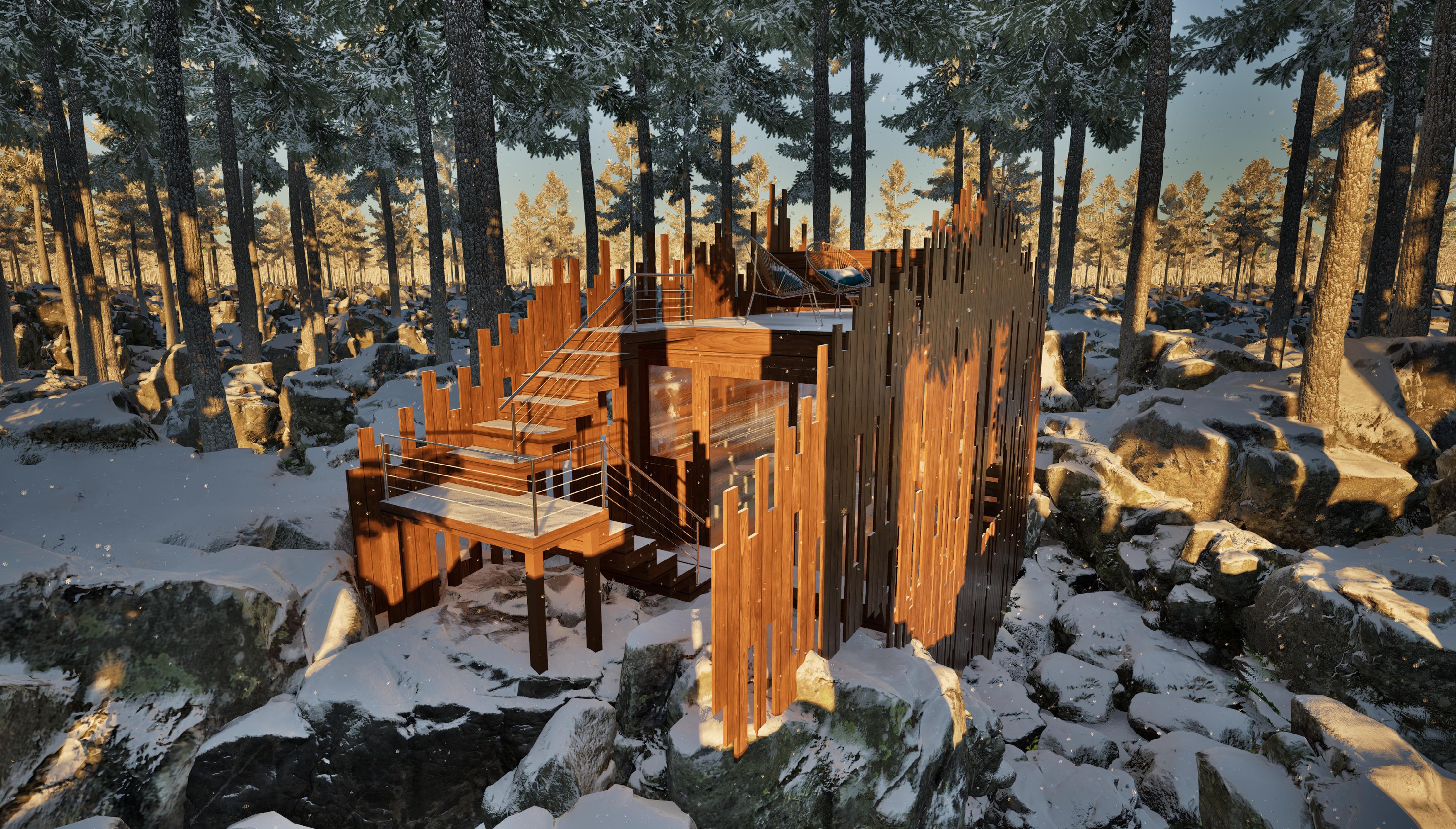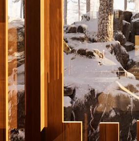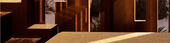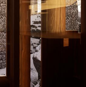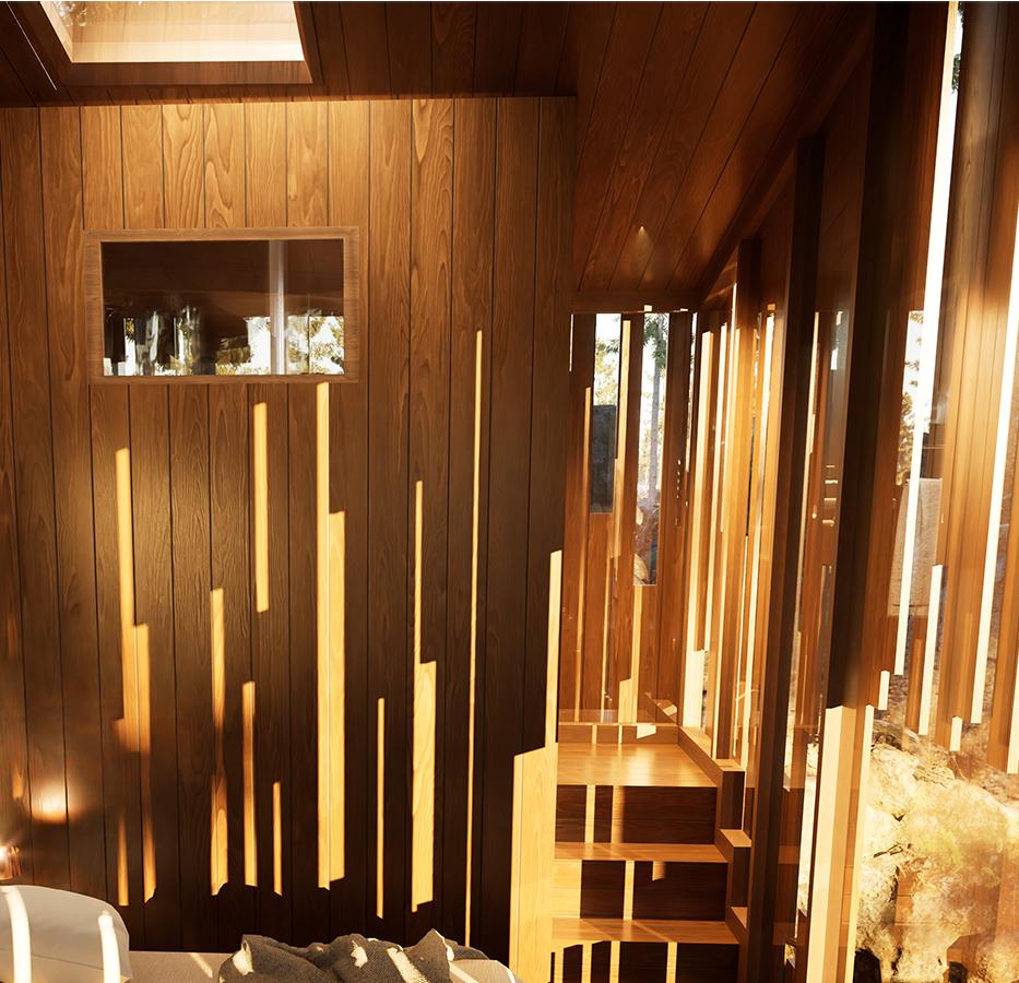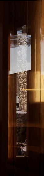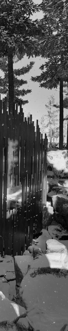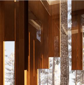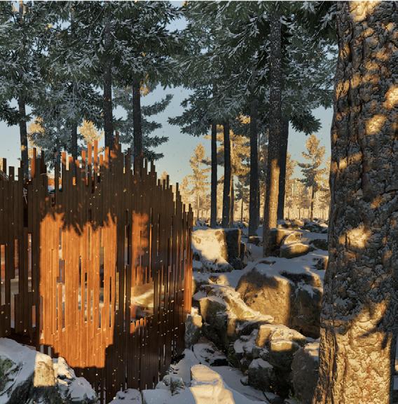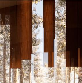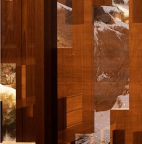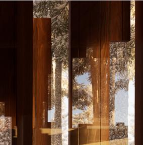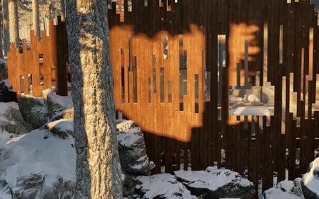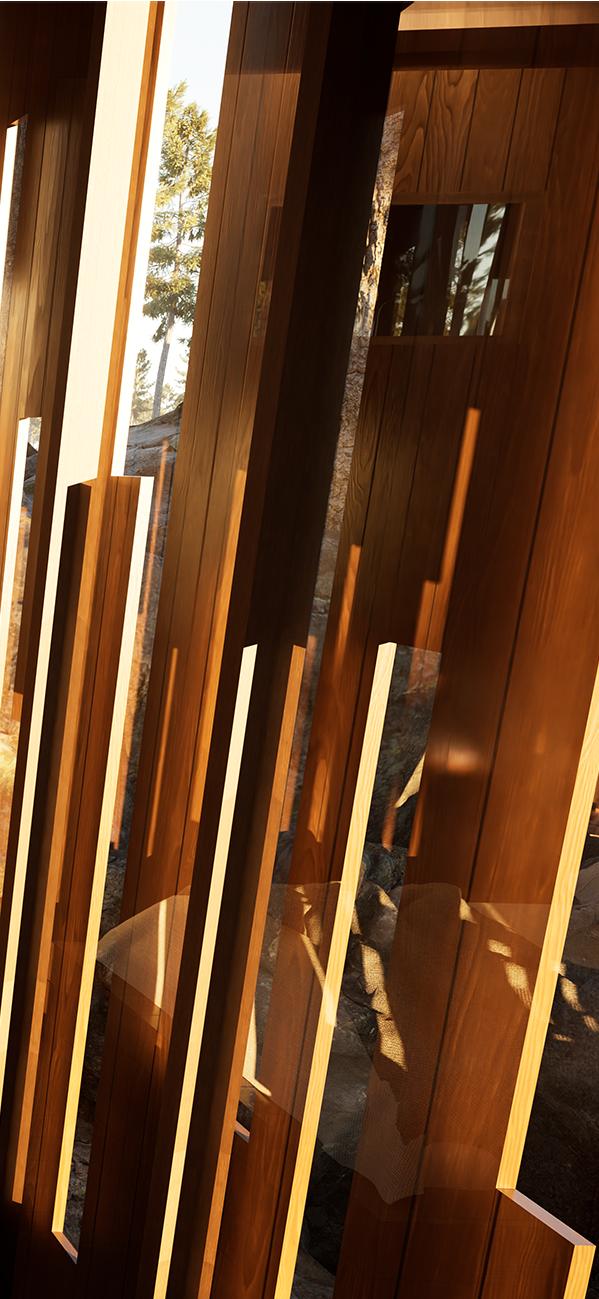 Il s’inspire de la verticalité des épicéas et fait écho à l’effet de bardage conçu par Kengo Kuma pour le musée, réorienté ici à 90 degrés. Afin de renforcer la perception de la topographie, la cabane s’adapte au creux, tant à l’extérieur qu’à l’intérieur, avec deux plateformes disposées de part et d’autre du lit.