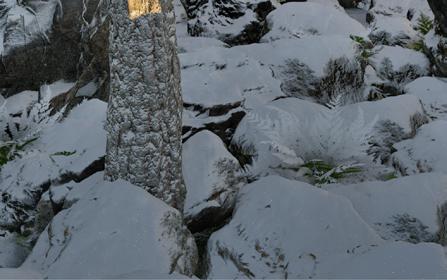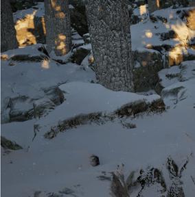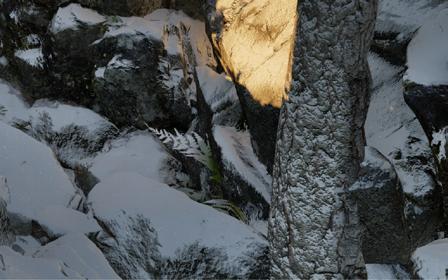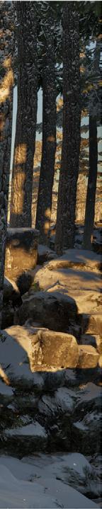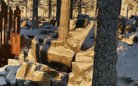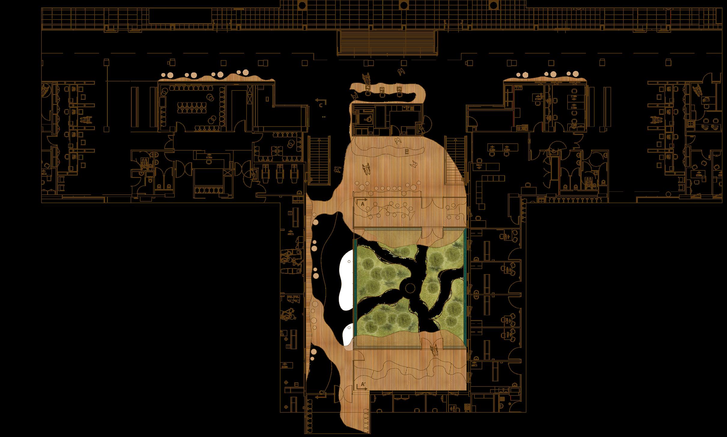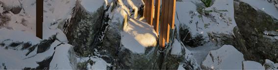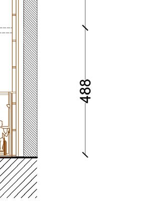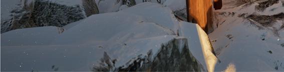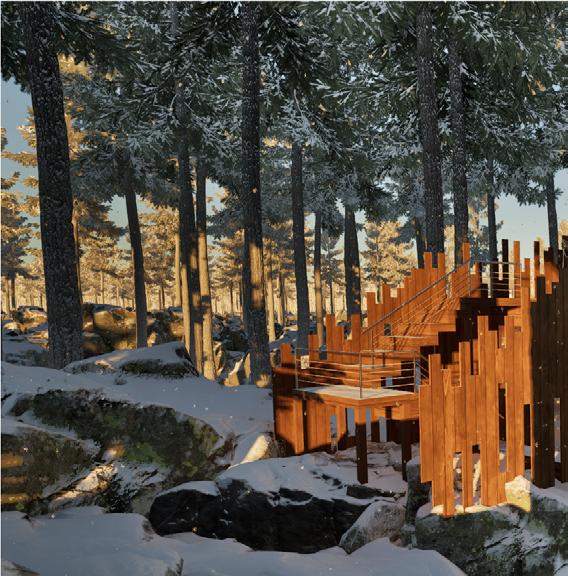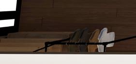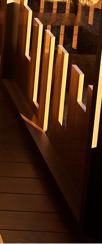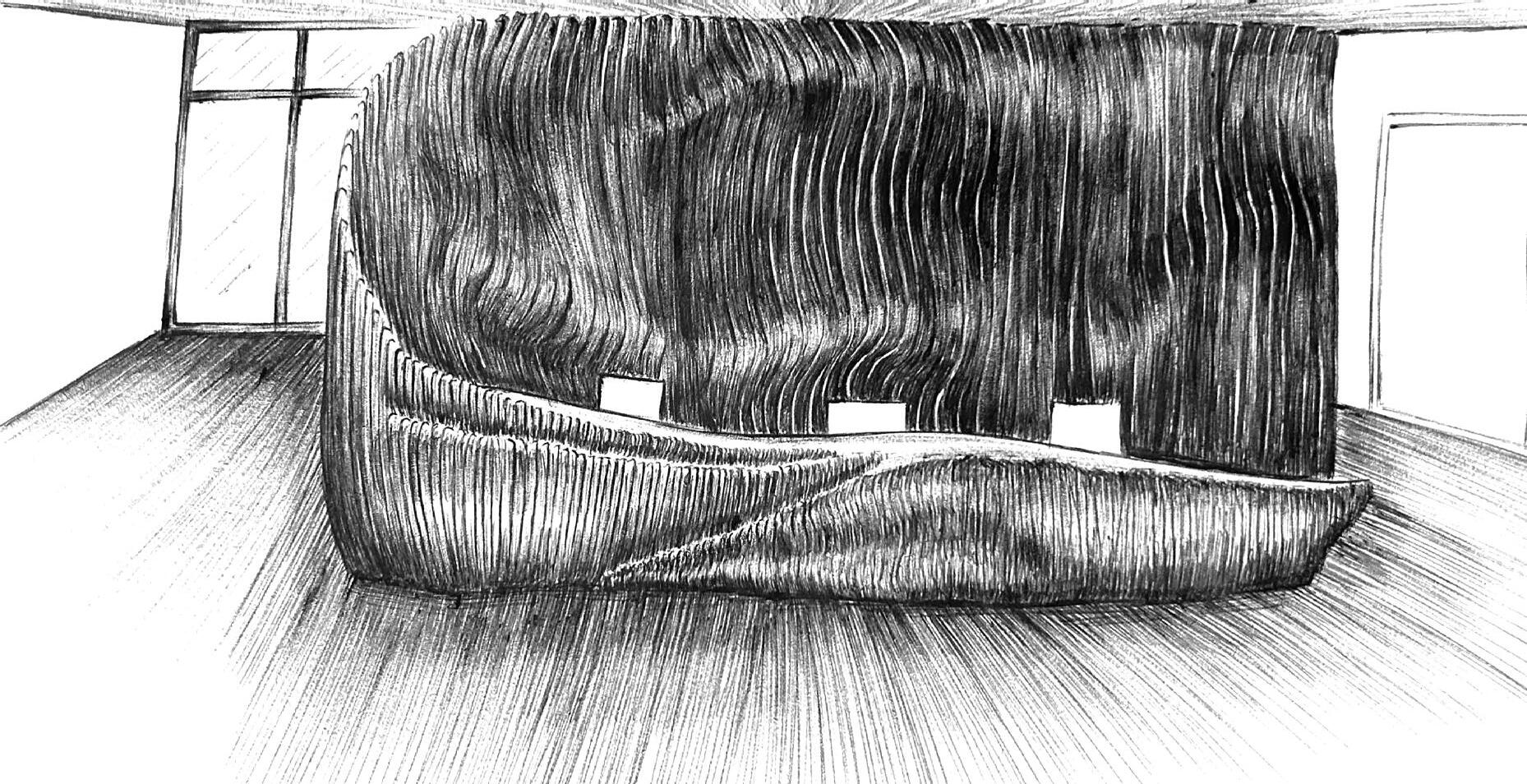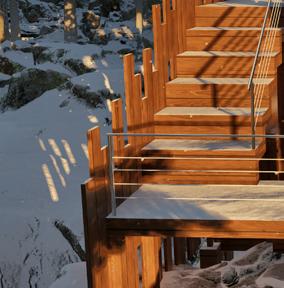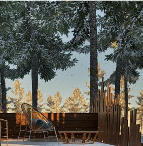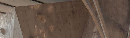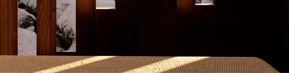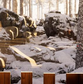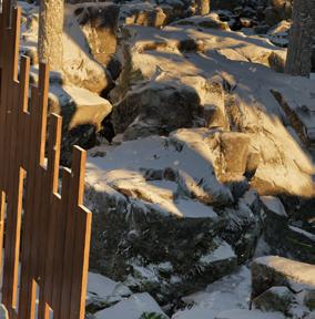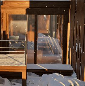 Il s’inspire de la verticalité des épicéas et fait écho à l’effet de bardage conçu par Kengo Kuma pour le musée, réorienté ici à 90 degrés. Afin de renforcer la perception de la topographie, la cabane s’adapte au creux, tant à l’extérieur qu’à l’intérieur, avec deux plateformes disposées de part et d’autre du lit.