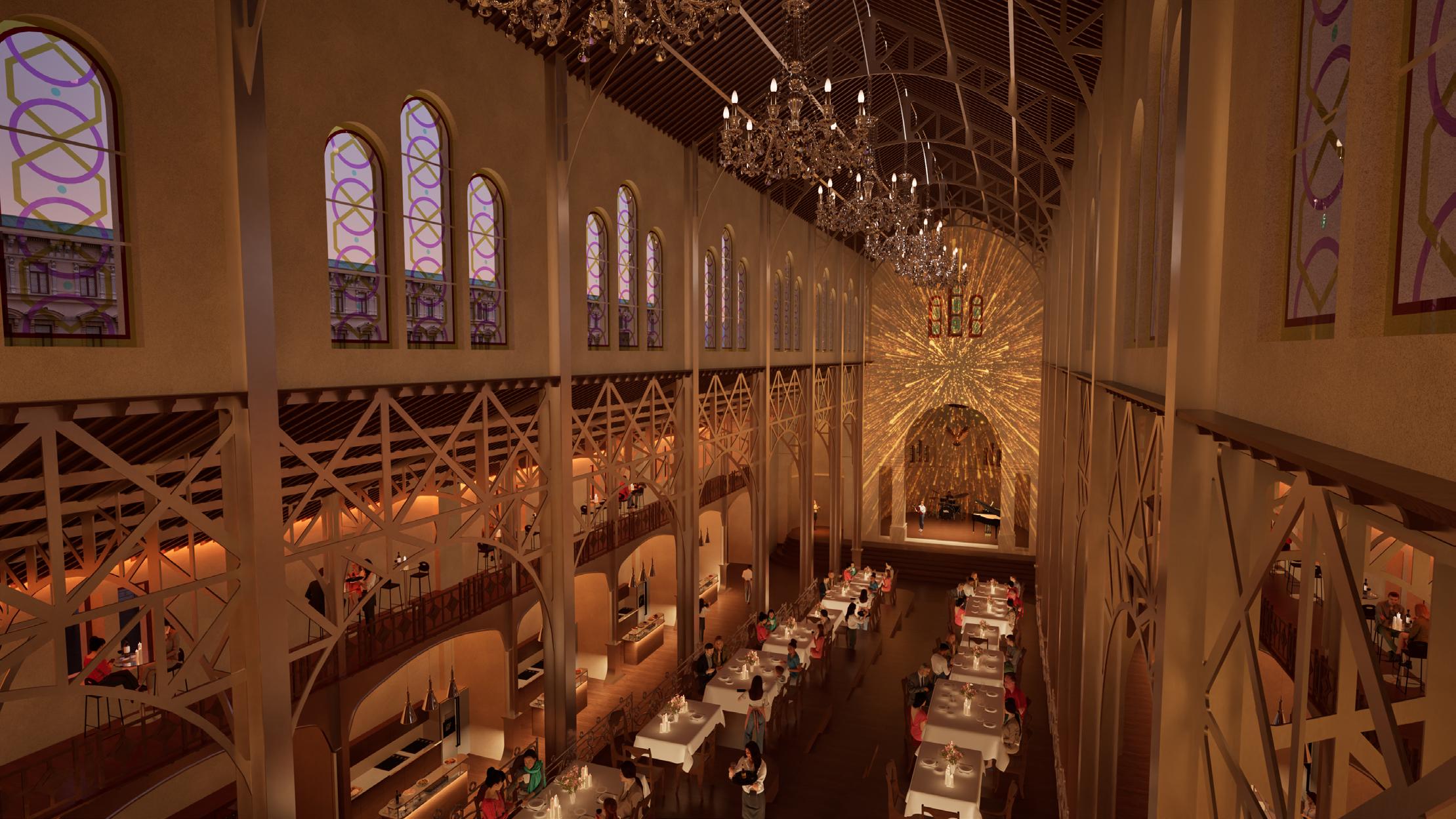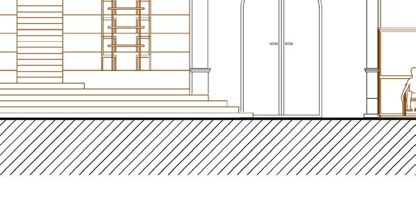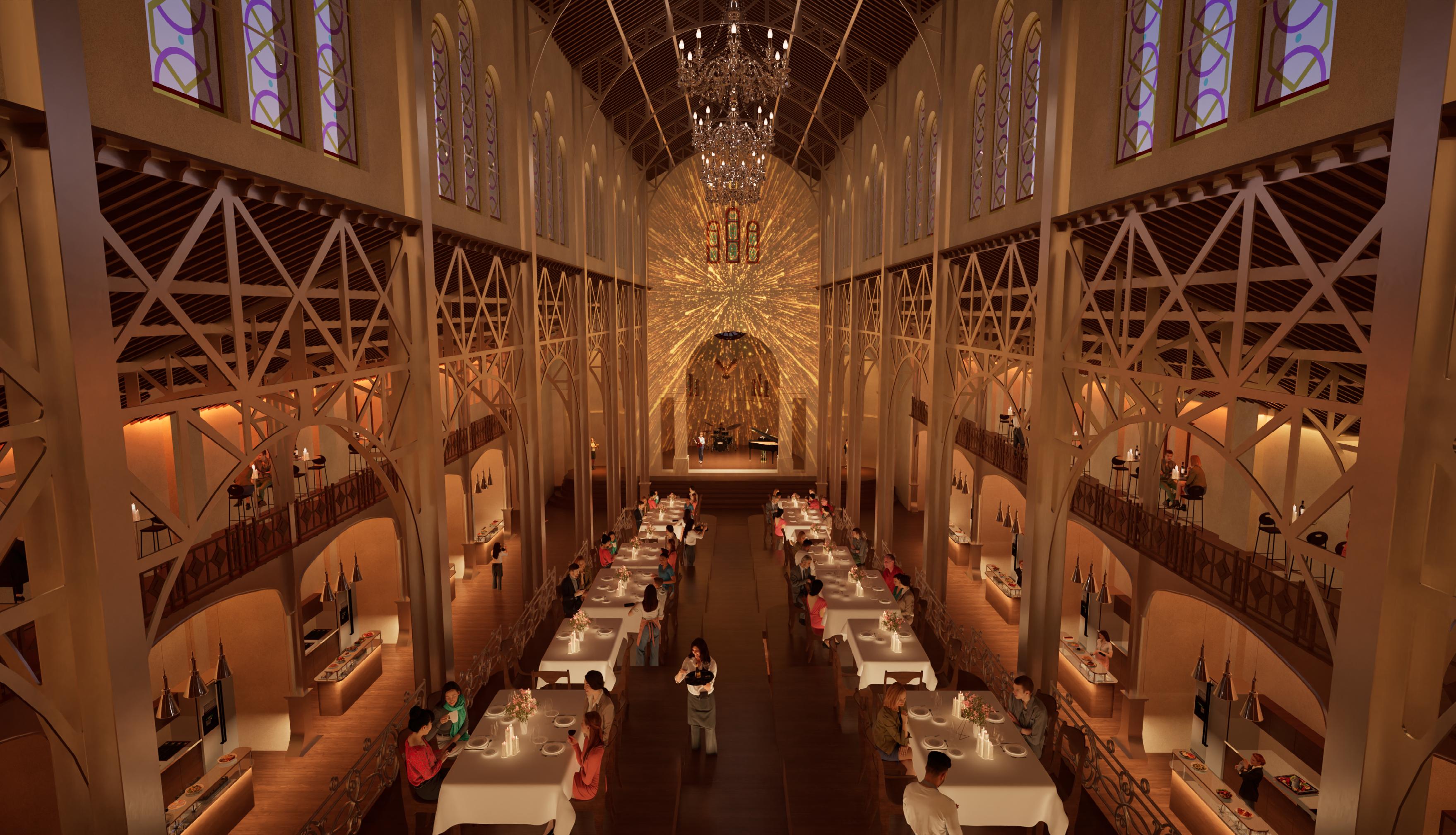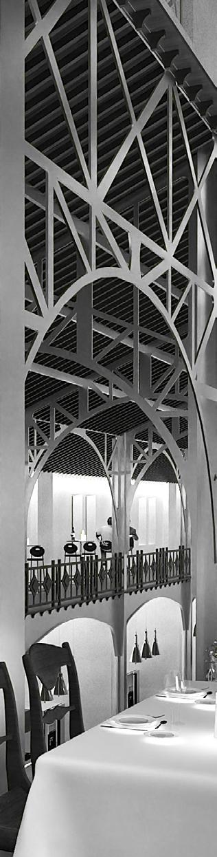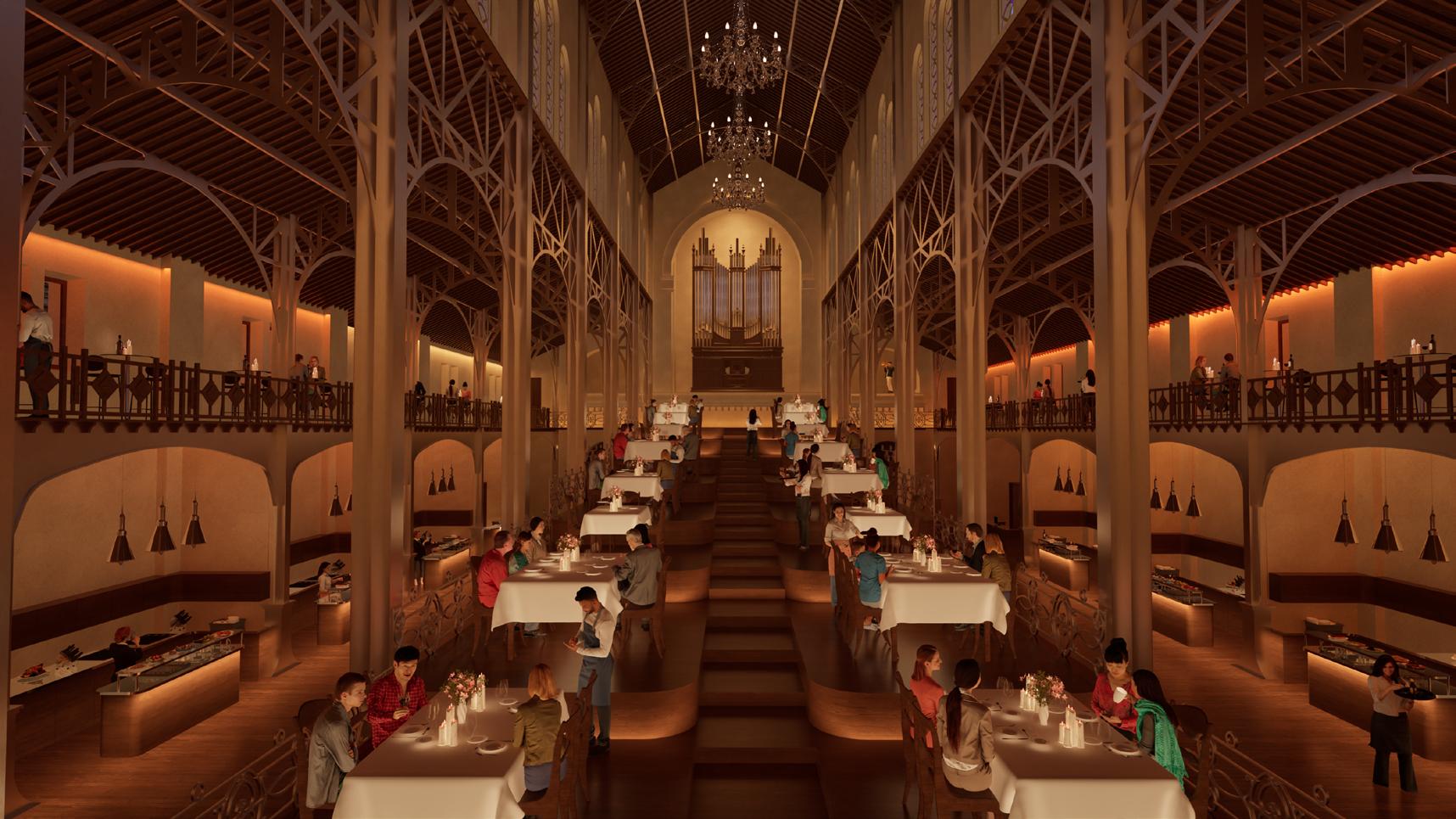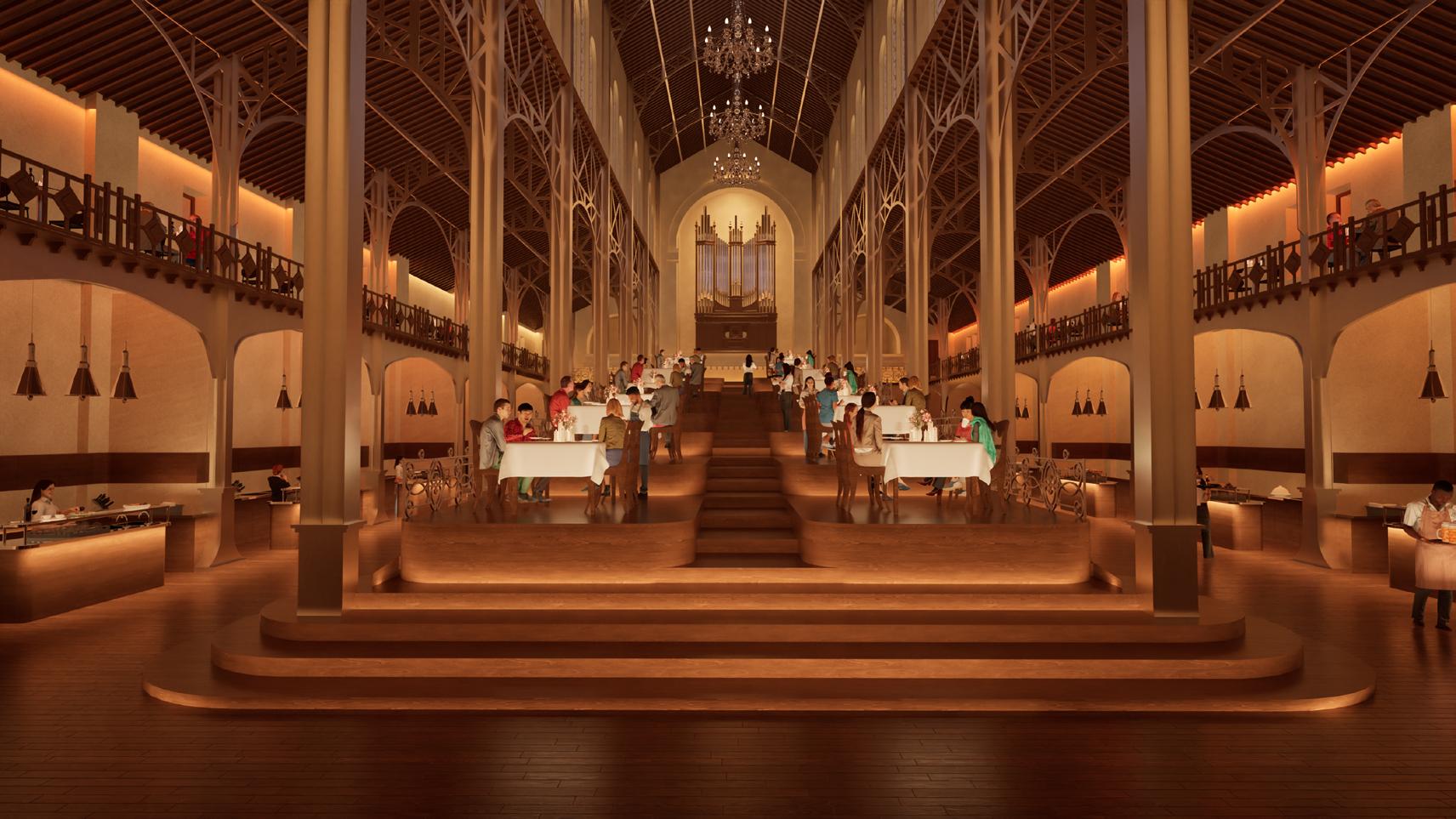 Afin d’offrir de multiples points de vue sur l’église, le restaurant se déploie le long d’un escalier monumental, sous lequel un bar plus intime fait office d’espace de transition pour accueillir les visiteurs. Cette entrée par le bas est conçue pour créer un effet de surprise et d’intrigue.