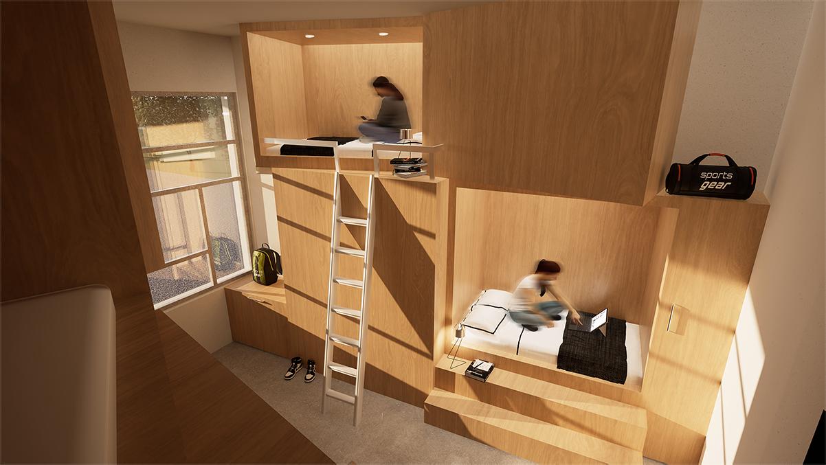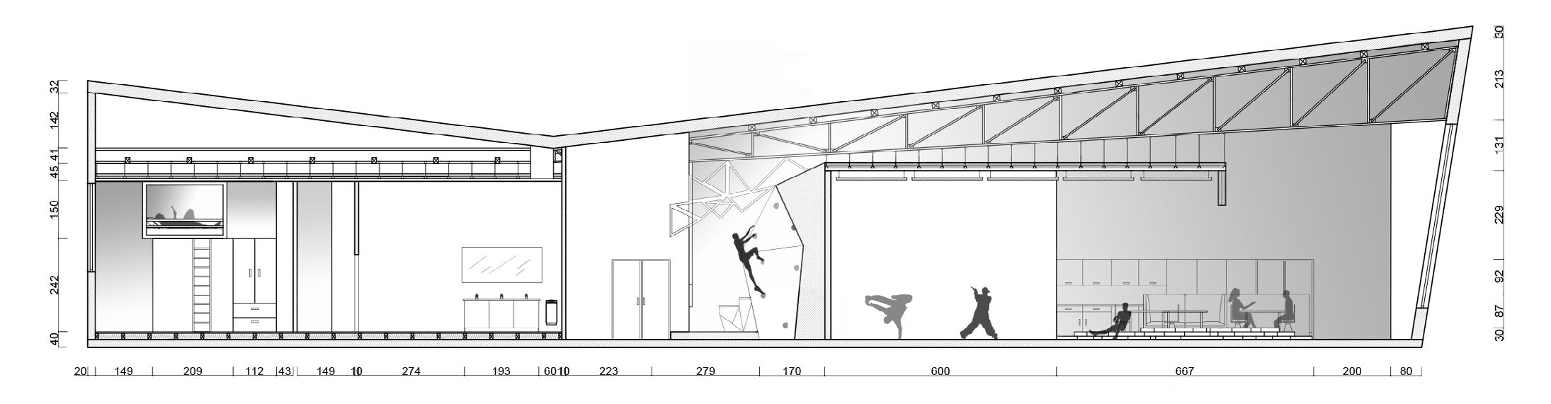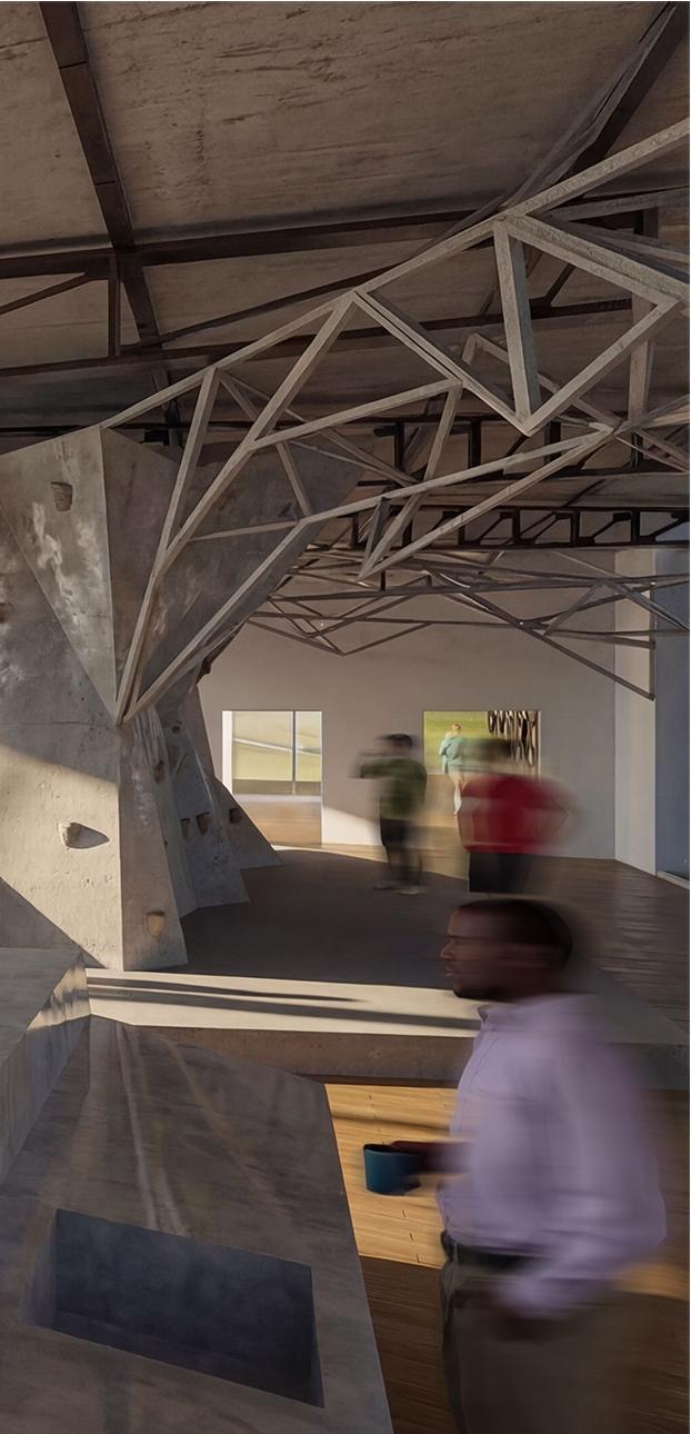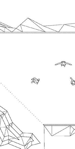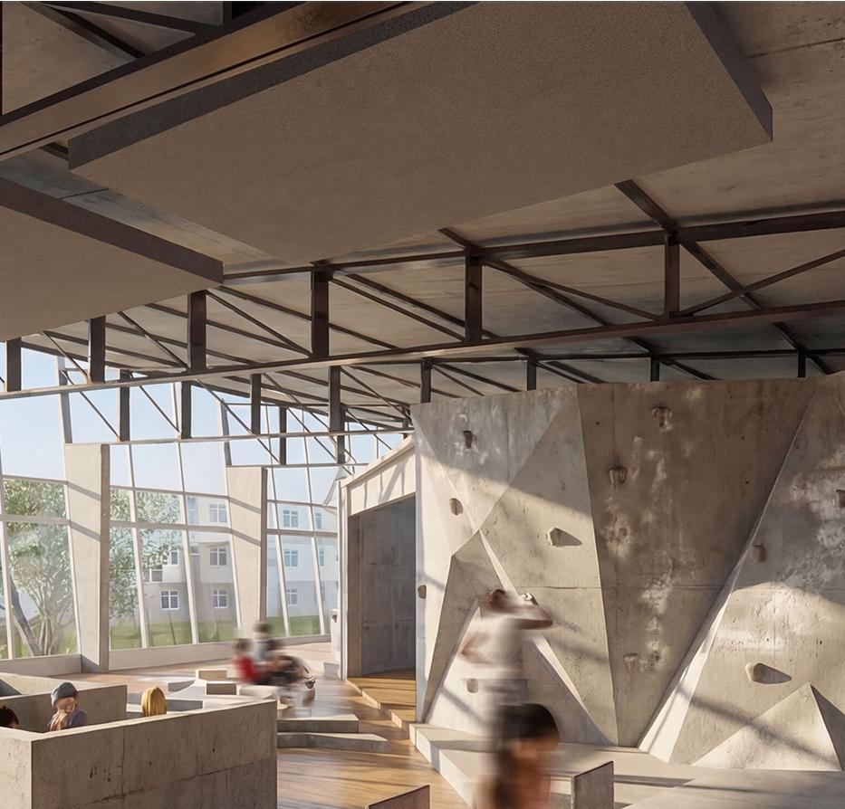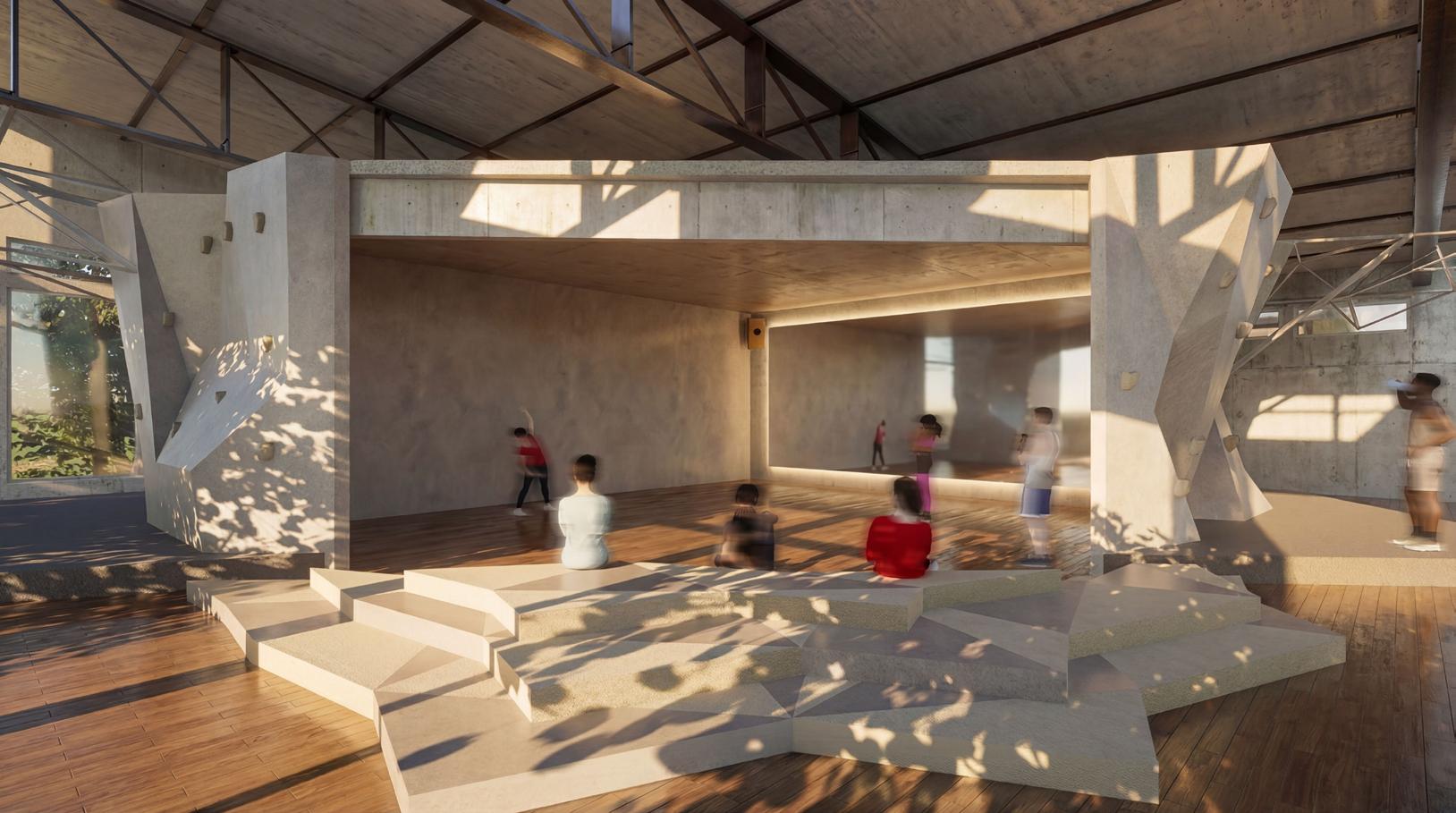 Dans le cadre des Jeux Olympiques de 2024, ce projet réinvente une partie du bâtiment sportif de la Cité Internationale Universitaire de Paris afin d’accueillir des étudiants-athlètes s’entraînant à l’escalade et au breakdance. Inspiré par les paysages montagneux, il explore des formes fracturées et des lignes dynamiques évoquant des failles, des crêtes, des canyons et des reliefs plissés.