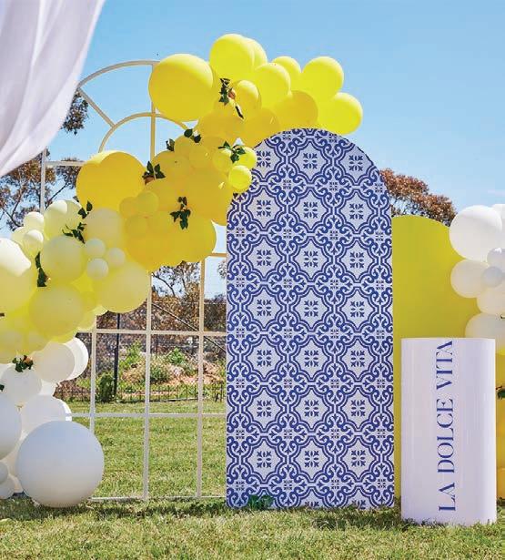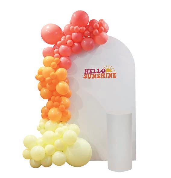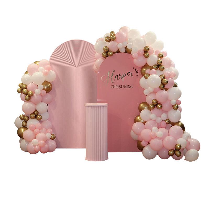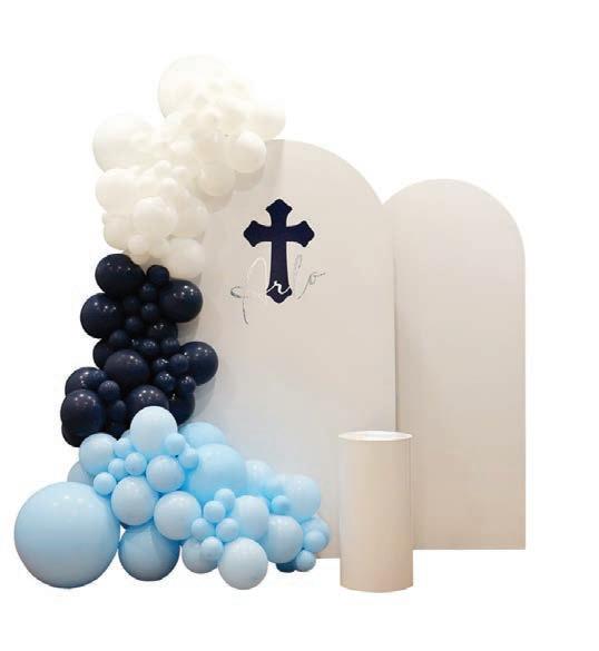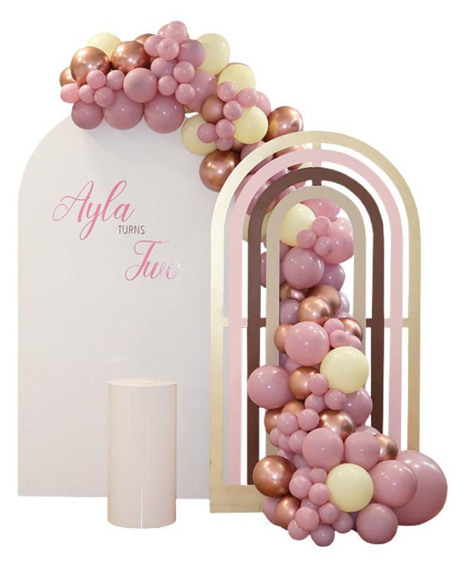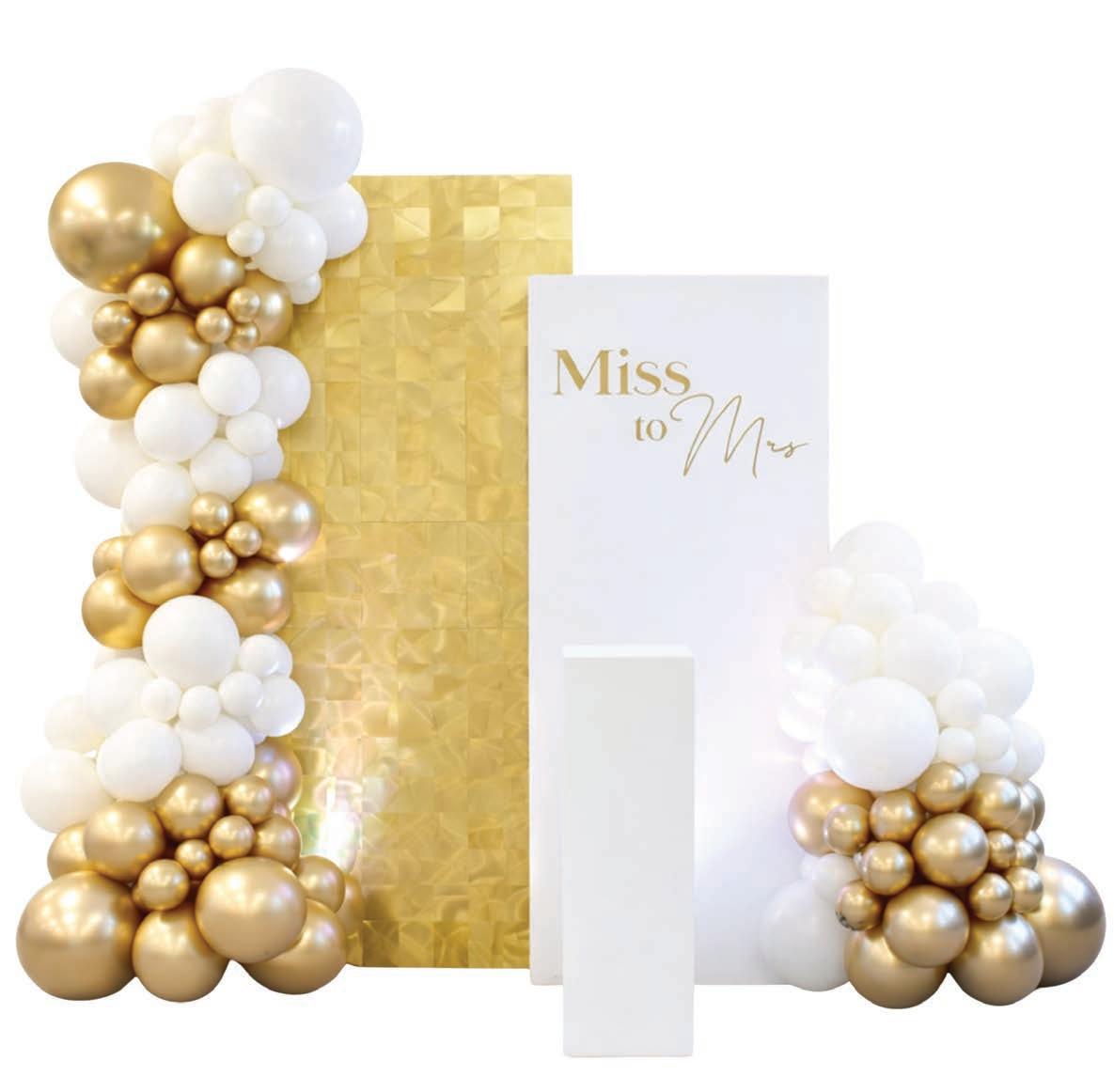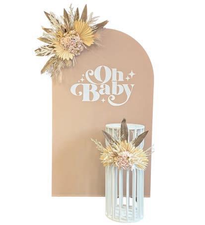 1 x Ripple Arch Panel 2.2m x 1.1m 1 x Wooden Sail Panel 1.6m x 90cm with Personalised Message 1 x 90cm Ripple Plinth 1 x Cake Stand 1 x 3m Deluxe Balloon Garland 1 x On Site Event Styling