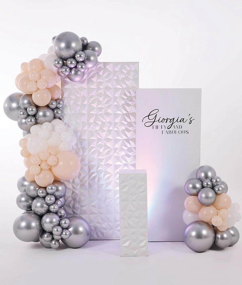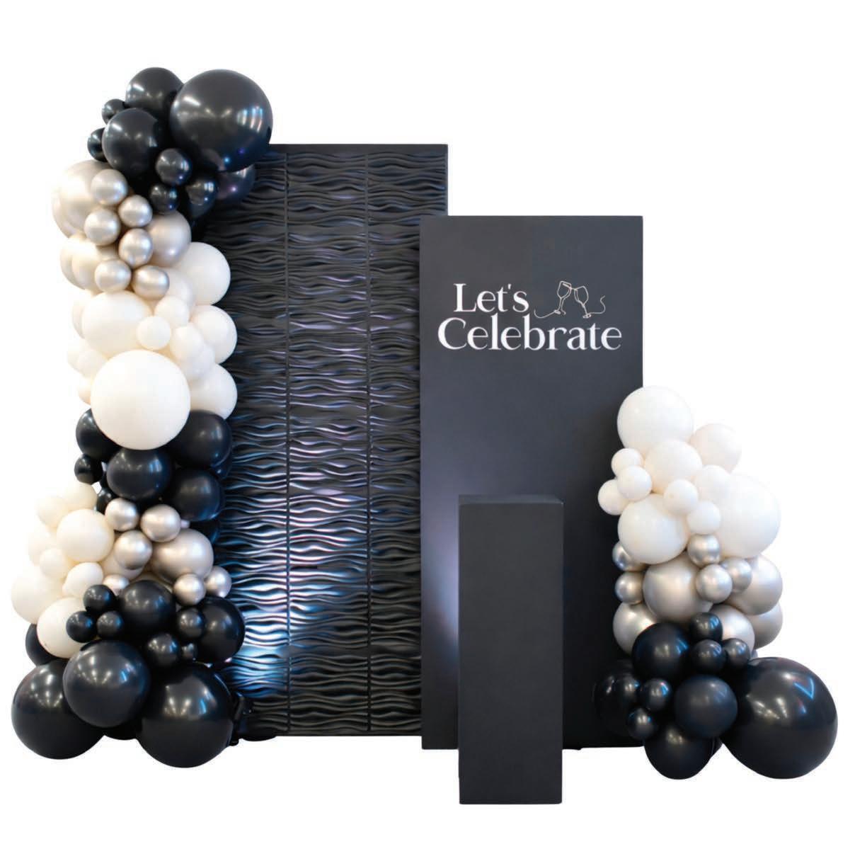 1 x 90cm Ripple Plinth 1 x 6m Deluxe Balloon Garland 1 x On Site Event Styling