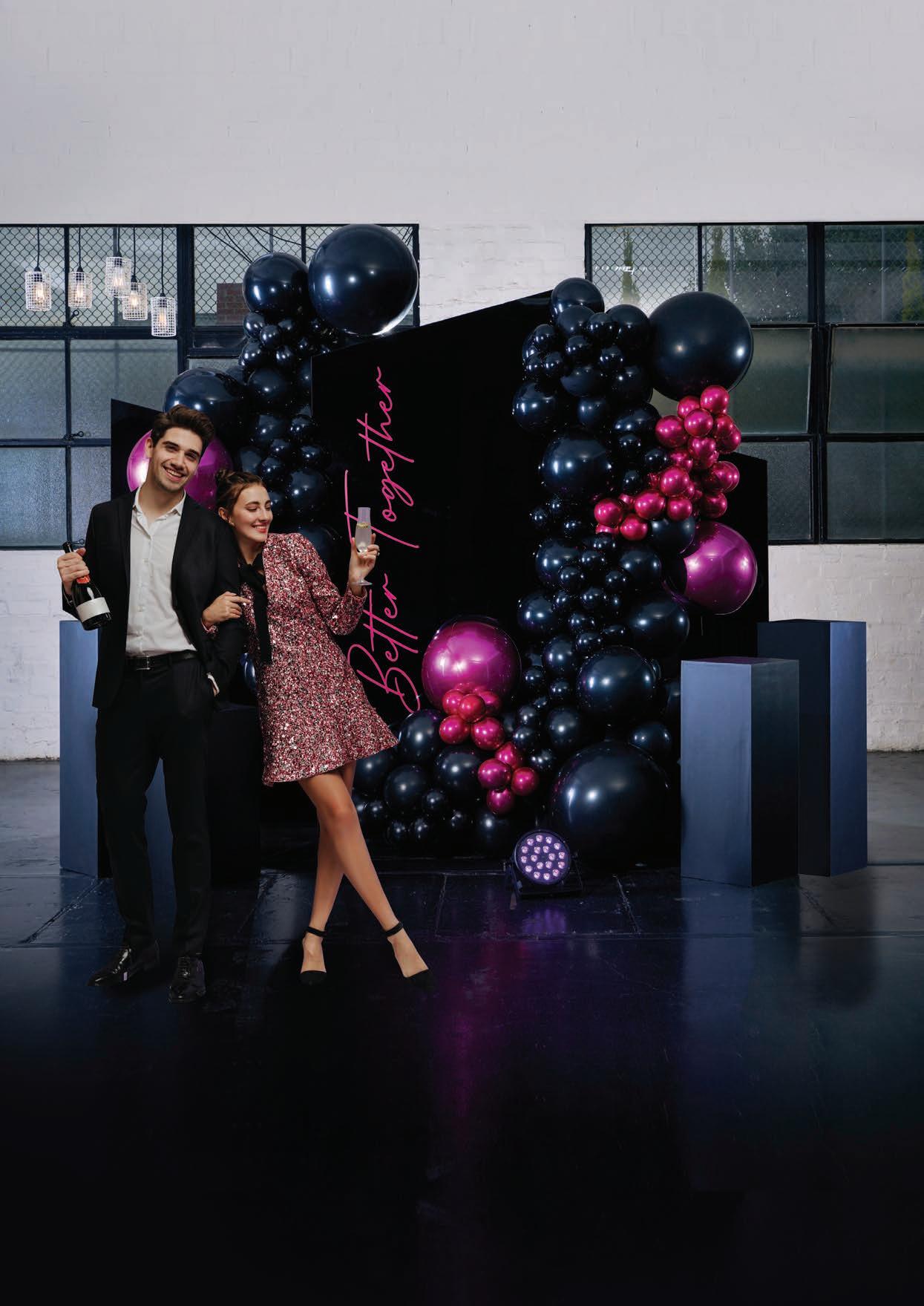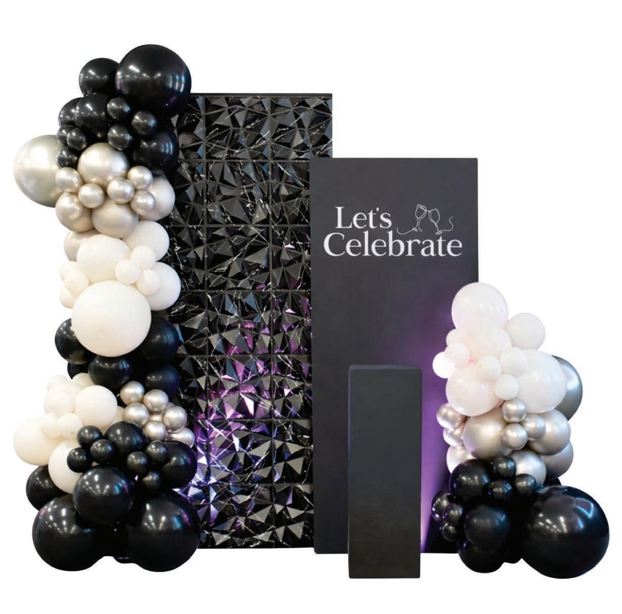 1 x 2m Velvet Round Backdrop 1 x 90cm Acrylic Plinth with Personalised Message 1 x 3m Ultimate Balloon Garland