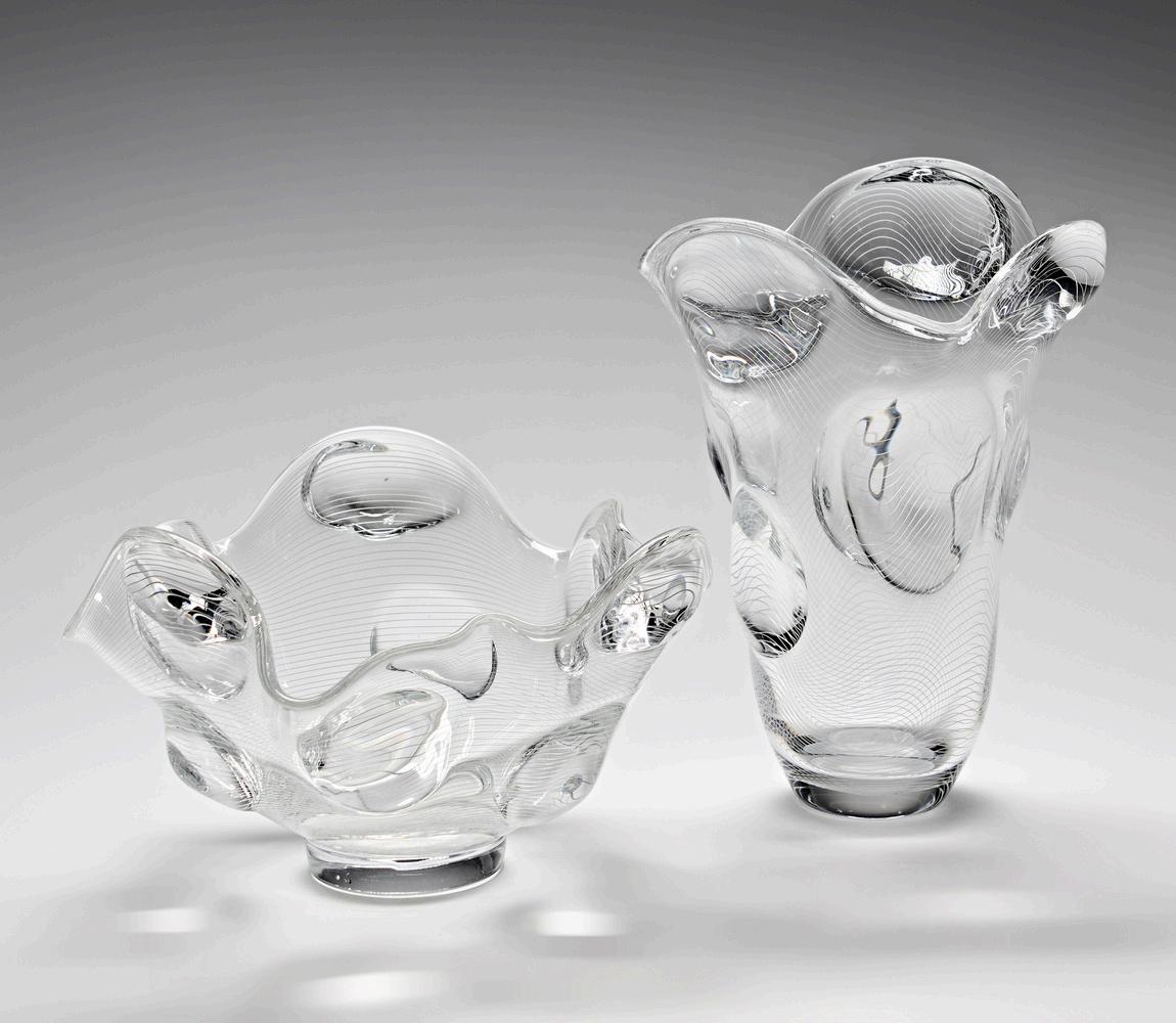 Originally from Bradford and a Central School of Art ceramics graduate, Peter discovered the “new” art of glassblowing while teaching in the US, establishing his first Thames-side studio in the 1960s. There, he pioneered revivals of historic iridising techniques.