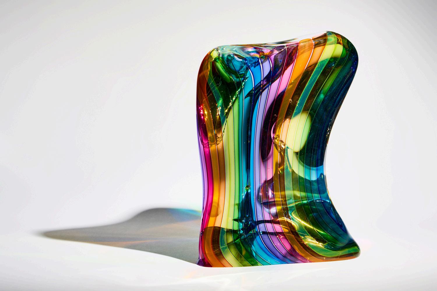 Tim creates highly polished glass surfaces to manipulate the enchanting interplay between the material and light, making this dance the driving force behind his expression. Recent experiments with reactive pigments and powders infuse his works with a painterly texture. Inspired by 1960s liquid light projections, he employs glass powders to create dynamic colour movements, distorting the hues and textures within his work.