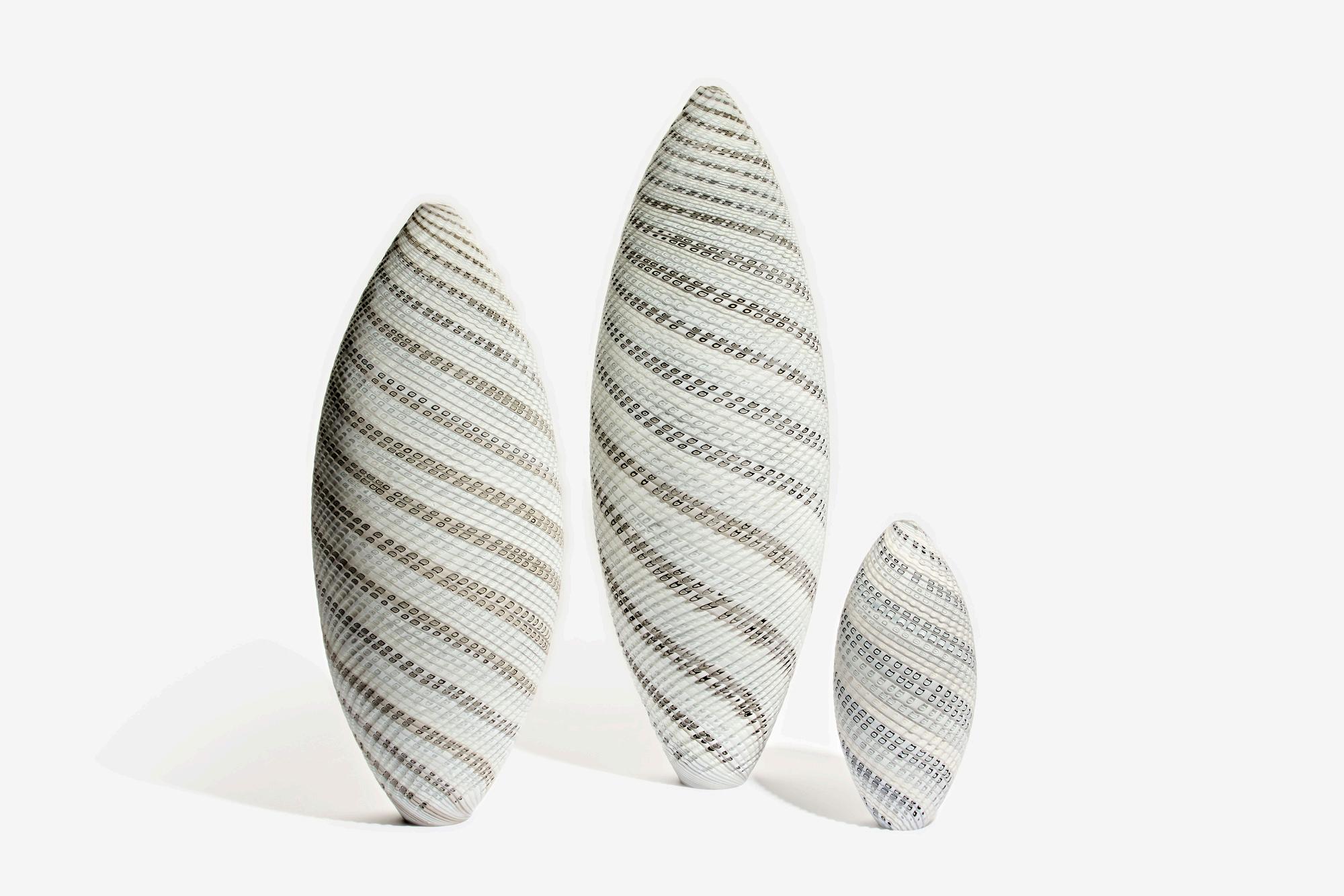 Layne’s Woven Forms are inspired by the Devon coastline and have been evolving for several years. This series of work is a result of intricate layering of different pre-made coloured canes around a molten form, that is twisted and when cold, cut into with a diamond wheel, to reveal vibrant colours beneath the surface. The effect is like water over precious stones, or the rock with its glimmering colours beneath, reflecting natural growth and corrosion.