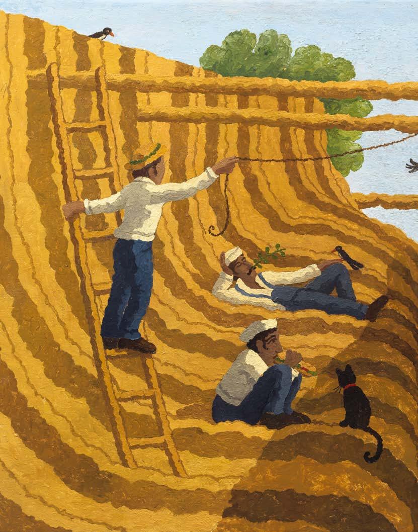 His pictures are moments in frozen time, there is an air of stillness and silence but at the same time so much is going on: people climbing ladders, dogs leaping, birds circling and workers constructing a boat. The paintings Montferri and Birds Flying in Vila-rodona show a typical European town, painted in a twentiethcentury cubist style in its geometry of interlocking planes but underpinning the structural reality birds fly along the wall of a church and draw you in evoking a spirituality beyond the material form. Ramiro calls the flying birds, ‘angels or souls of the sky’. His travels in the English countryside inspired his early paintings and his interest in the work of Gainsborough and Hogarth. He is also interested in the work of Watteau and Henri Rousseau. The flower paintings, Flower I, II and III, have a feel of eighteenthcentury embroidery in their flat blocks of colour.