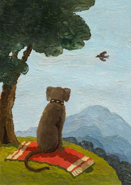 keen sailor. Self Portrait has a young artist in his swimming shorts, easel in hand on a cloud but Ramiro insists the picture is not of him but an archetype. There can be a mountain to climb in The Light of the Day Reaching for the sky is a woman at the top of a tree, arms outstretched heavenward watched by a dog at the bottom of the ladder in Theresa and the Moon, a semi-religious event. There is something too of the early Italian Renaissance. Ramiro loves the work of Giotto: ‘Clouds are inhabited by saints and angels’ he laughs.
