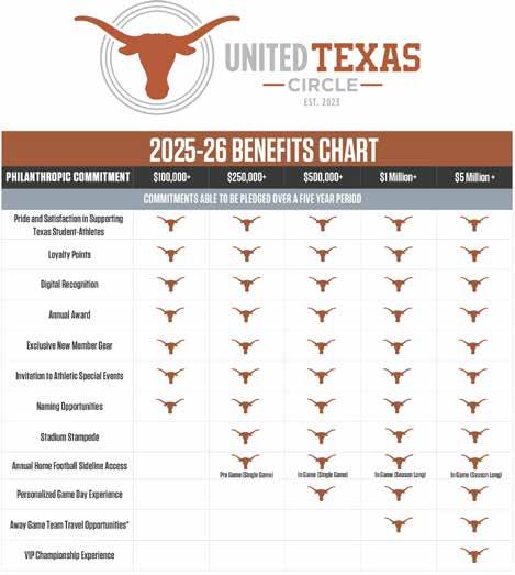 The United Texas Circle was established in April 2023 to recognize donors whose multi-year commitments go above and beyond their seat-related giving. These gifts expand the tools and resources for Texas Longhorns student-athletes to grow as people, develop as leaders, and succeed as competitors.