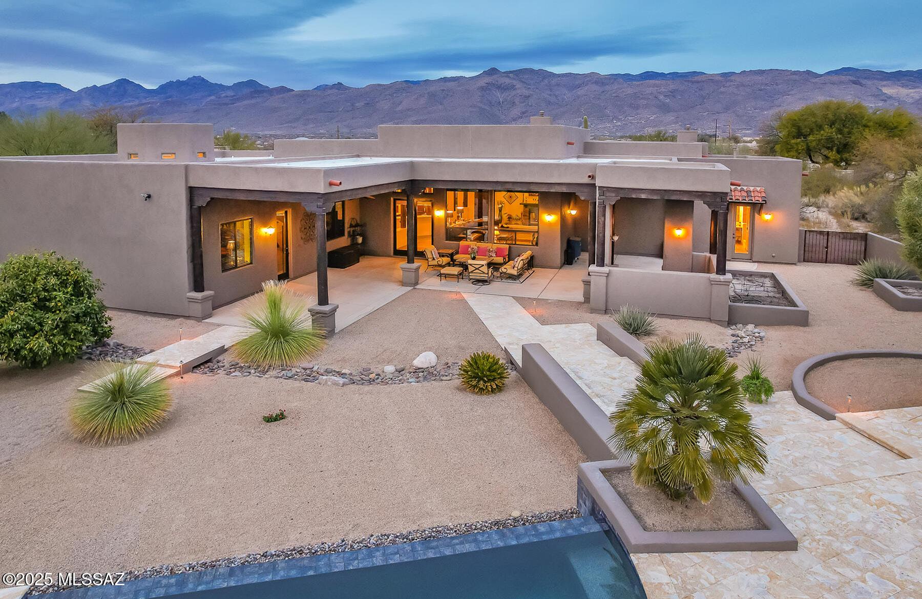 High up on a hill top in a gated community overlooking a sea of lights & softening pink of the Catalina Mountains at sunset, All this & a stunning contemporary home. The great room has walls of windows overlooking an extensive covered patio and an infinity pool & spa. Don’t miss the roof deck with forever views in all directions. A beautiful home for entertaining & for enjoying the joy of desert living.