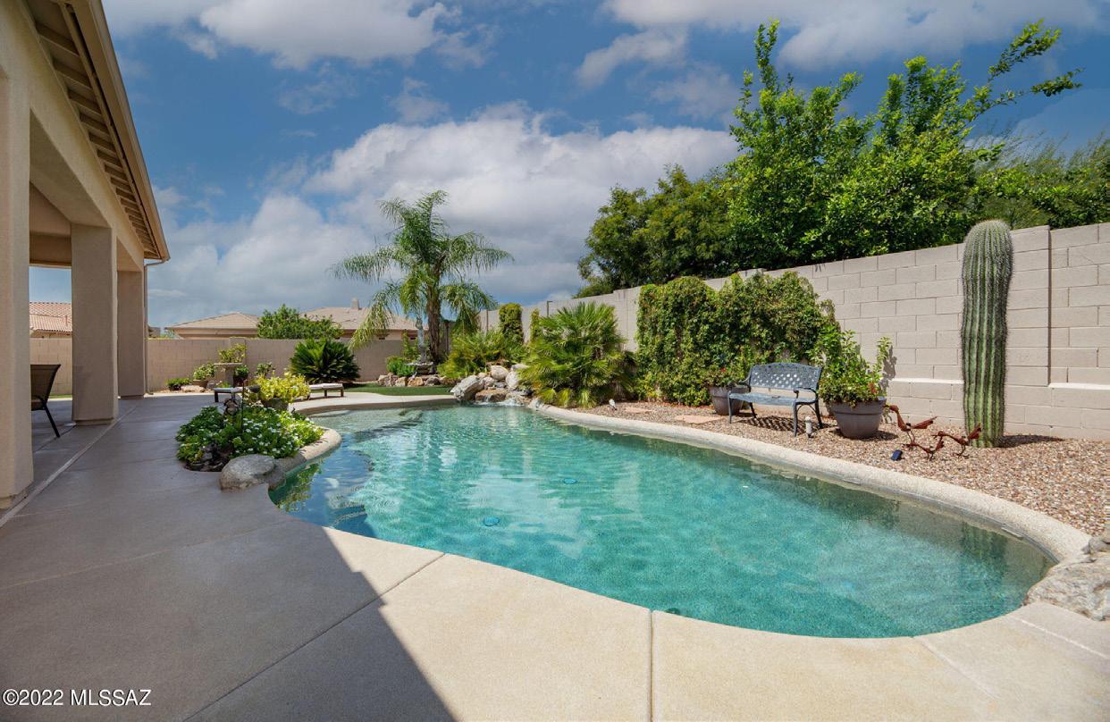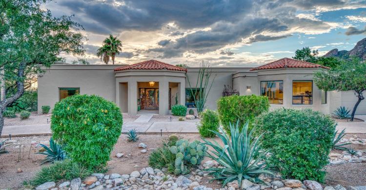 soft contemporary in prestigious Pima Canyon. House features a great room & DR, office, family room, cozy breakfast rm & split br plan. Lushly landscaped yard w/75’ lap pool, built-in BBQ & large covered patio is perfect for entertaining.
