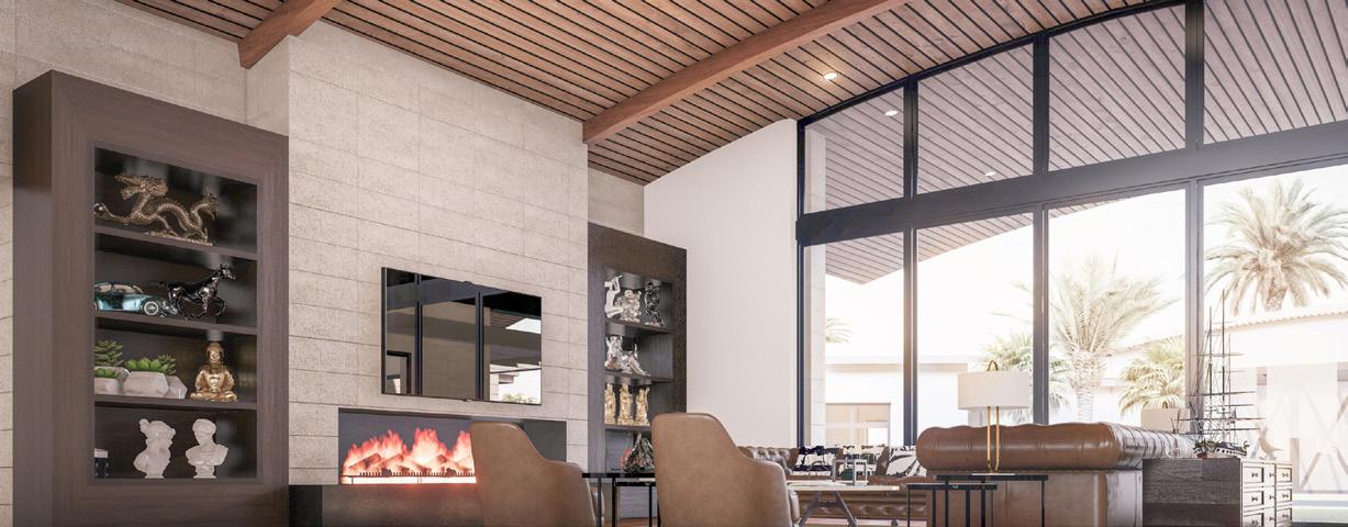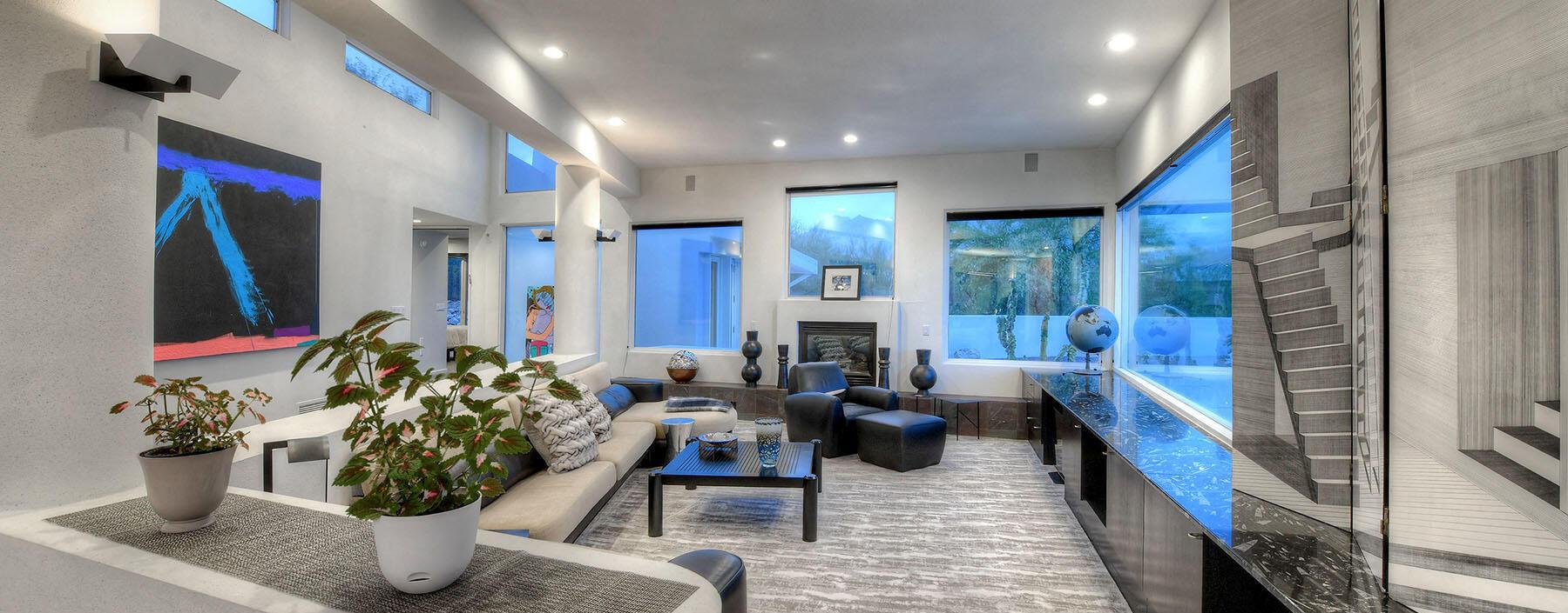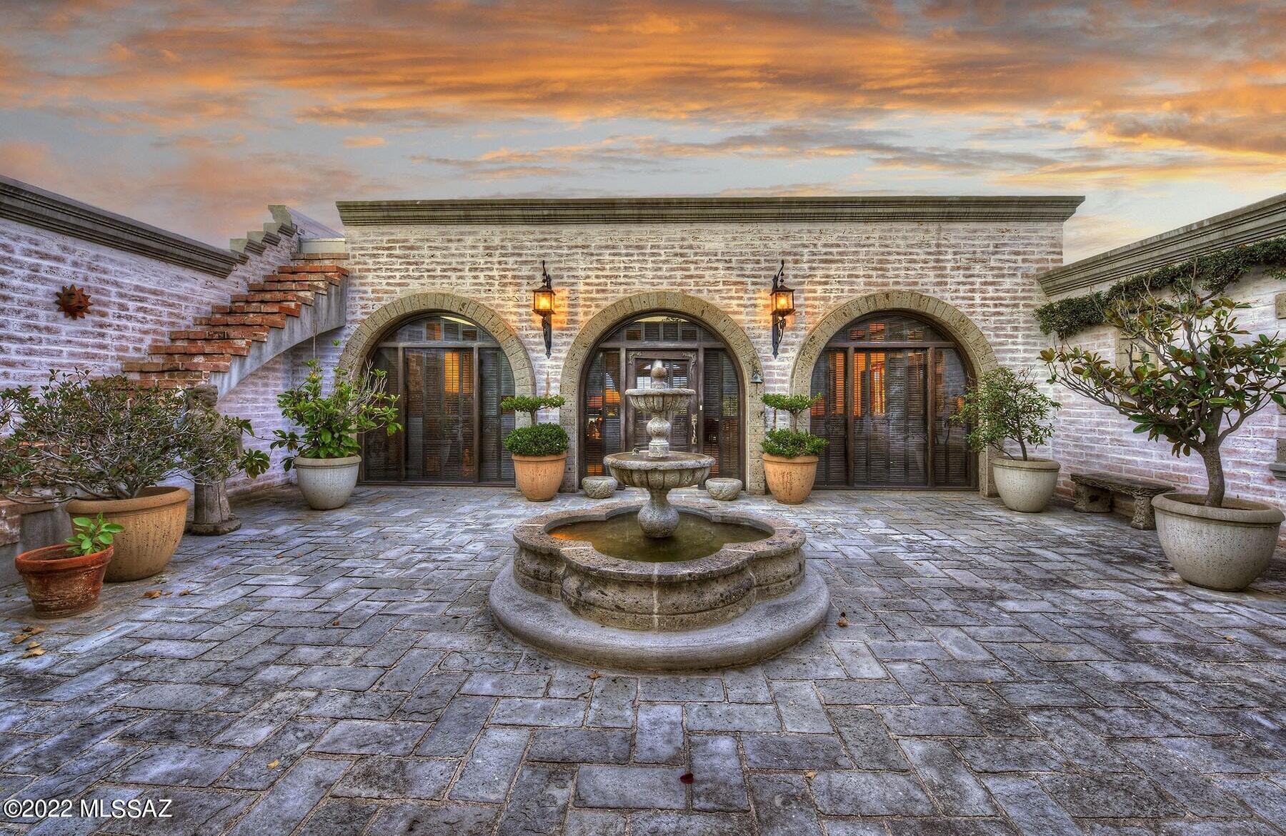 stunning, minimalist contemporary executive estate is nestled within gated, renowned Canyon Ranch Resort. Designed by New York architect Bromley Calderi and featuring two homes on two lots with a common courtyard entry, this estate is ideal as a corporate retreat, family compound, or multi-generational residence. The property is located at the end of a private cul-de-sac and offers sweeping Catalina & Rincon Mountain views! The 2-bedroom, 4,160 sq. ft. main house offers walls of windows framing mountain views, gallery-style walls for artwork, and soaring ceilings. The dramatic living room/kitchen with breakfast area offers a fireplace.