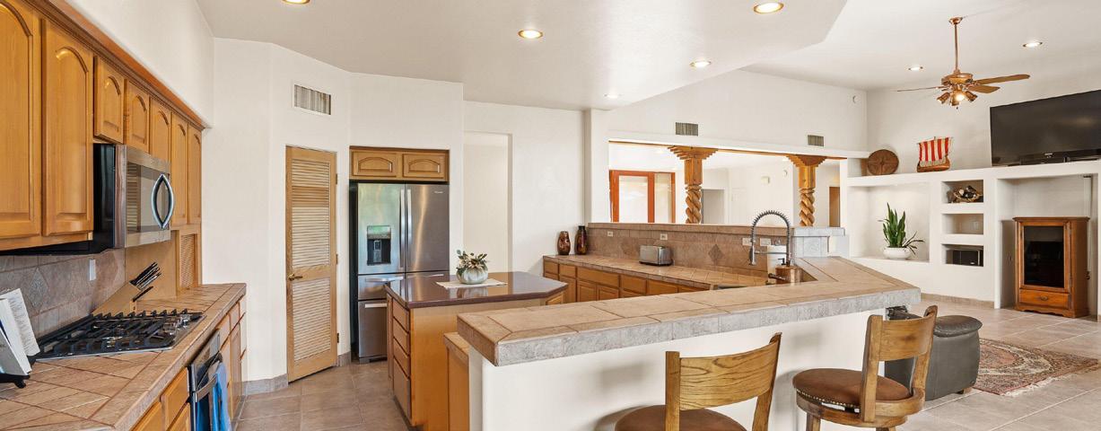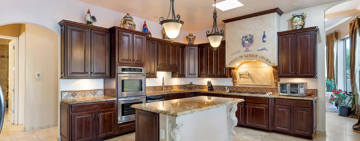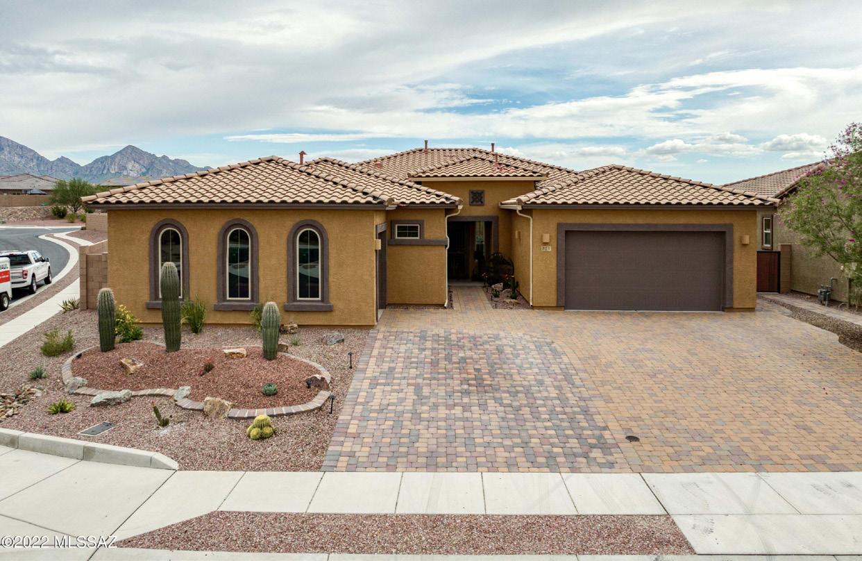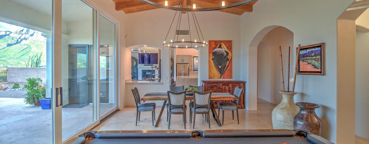 home in the world-renowned Canyon Ranch. Nestled on quiet cul-de-sac, this elevated lot has stunning views of Catalina & Rincon mountains from inside & out. All details have been considered in this impeccably maintained, desert-inspired home. Imagined by award winning interior designer Lori Carroll, every inch of space has been done to perfection. Entering through the solid wood territorial style front door your eyes are drawn to the light filled foyer & fabulous great room. The kitchen acts as a luxurious anchor for the home w/counter to ceiling glass tile backsplash, stone countertops & custom wood cabinetry w/integrated lighting.