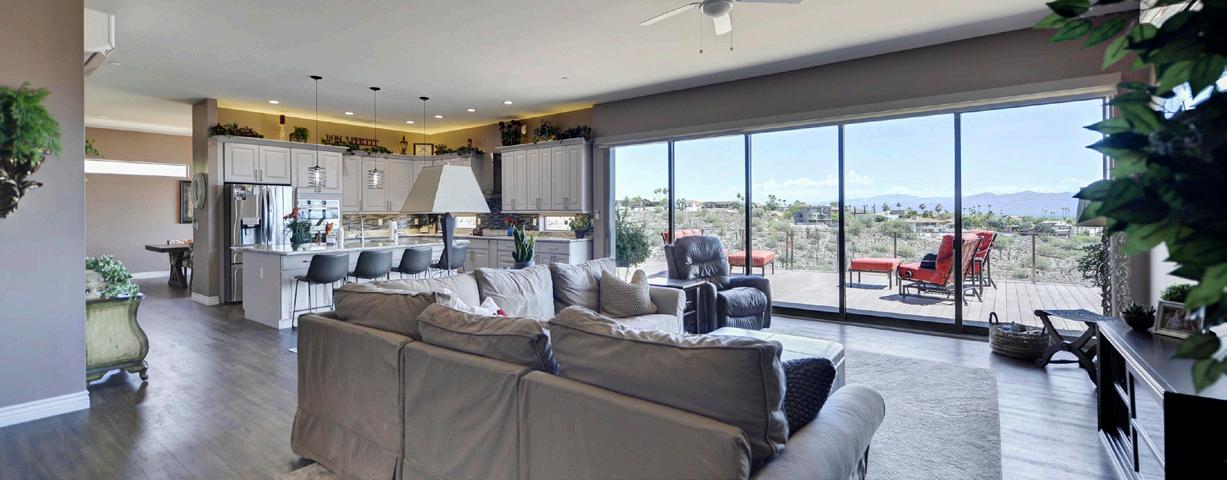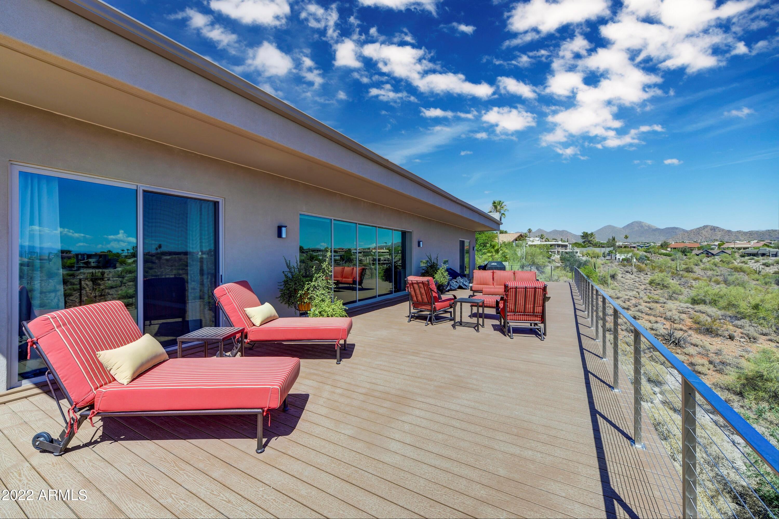 new custom home completed in 2022. This home is a must see! From the time you walk in the front door with a 20’ patio slider that opens up to a 70’ cantilever deck looking directly at Four Peaks. This is by far one of the BEST views in Fountain Hills. This is a highly energy efficient home with foam insulation mini splits and solar. Main house has 3BR/3.5BA with views from the Master bedroom, living room, and dining area but there is more! Underneath is a guest house with full bed bath and kitchen. There is an oversized 2 car garage connected to the main house with an 8 car drive through garage underneath that can fit your boat, ATV’s quads ect.