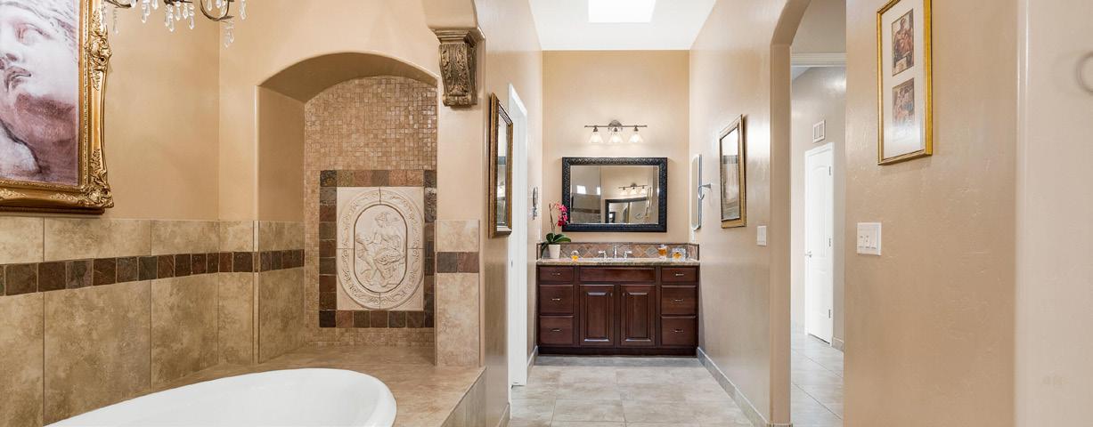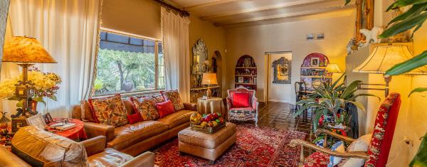 of Tucson’s most significant and historic properties is now on the market. This amazing Adobe Hacienda style home, built as the US Calvary’s trading post in 1873, has had only 3 previous owners. Enter through the hand carved wooden arched entryway to the zaguan or grand living room. Four generous bedrooms (2 w/ sleeping lofts) flow seamlessly from the living room. The master bedroom has THE most breathtaking view of the 60 ft long, stone edged pool! At the end of the pool the unobstructed view continues to the majestic Catalina mountains. The master bedroom’s ensuite bathroom features hand glazed tiled double sink vanity.