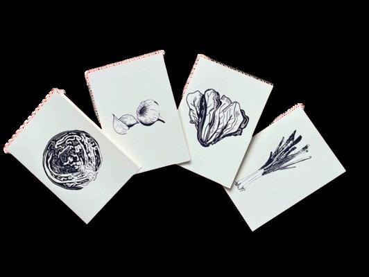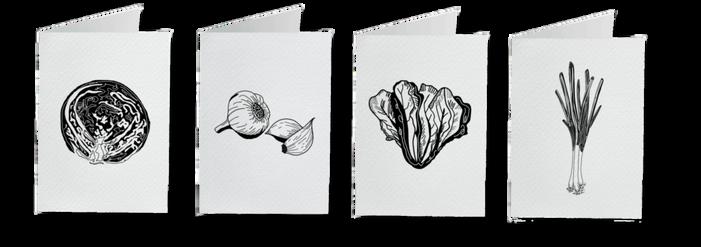Setoffourveggiegreetingcardswithenvelopes.Oneofeach: cabbage,garlic,lettuce,scallion|GC-SET-VEG|$8/RRP$16