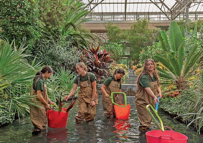 It takes many hands (and waders) to keep the Oval Basin pristine. Here, a team from our Teen Volunteer program, under the direction of Senior Horticulturist Lauren Hill, collect fallen plant material from the central water feature in the East Conservatory. They also perform pruning and grooming of the lower level plant material that is easier accessed via the pools.