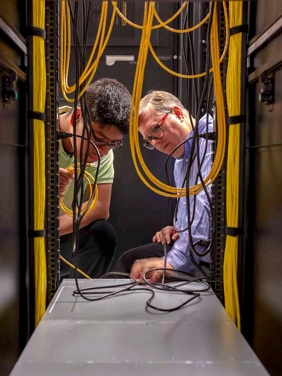 Intern Augustin Espinosa and Associate Director, Network Operations Dwight Effinger connect a new storage array in Longwood’s main server room. Photo by Daniel Traub.