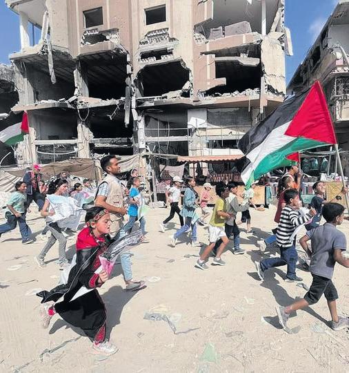 Sheffield PSC’s partners in Gaza organised the event, and shared photos of more than 20 children with Palestinian flags and posters running through the rubble.