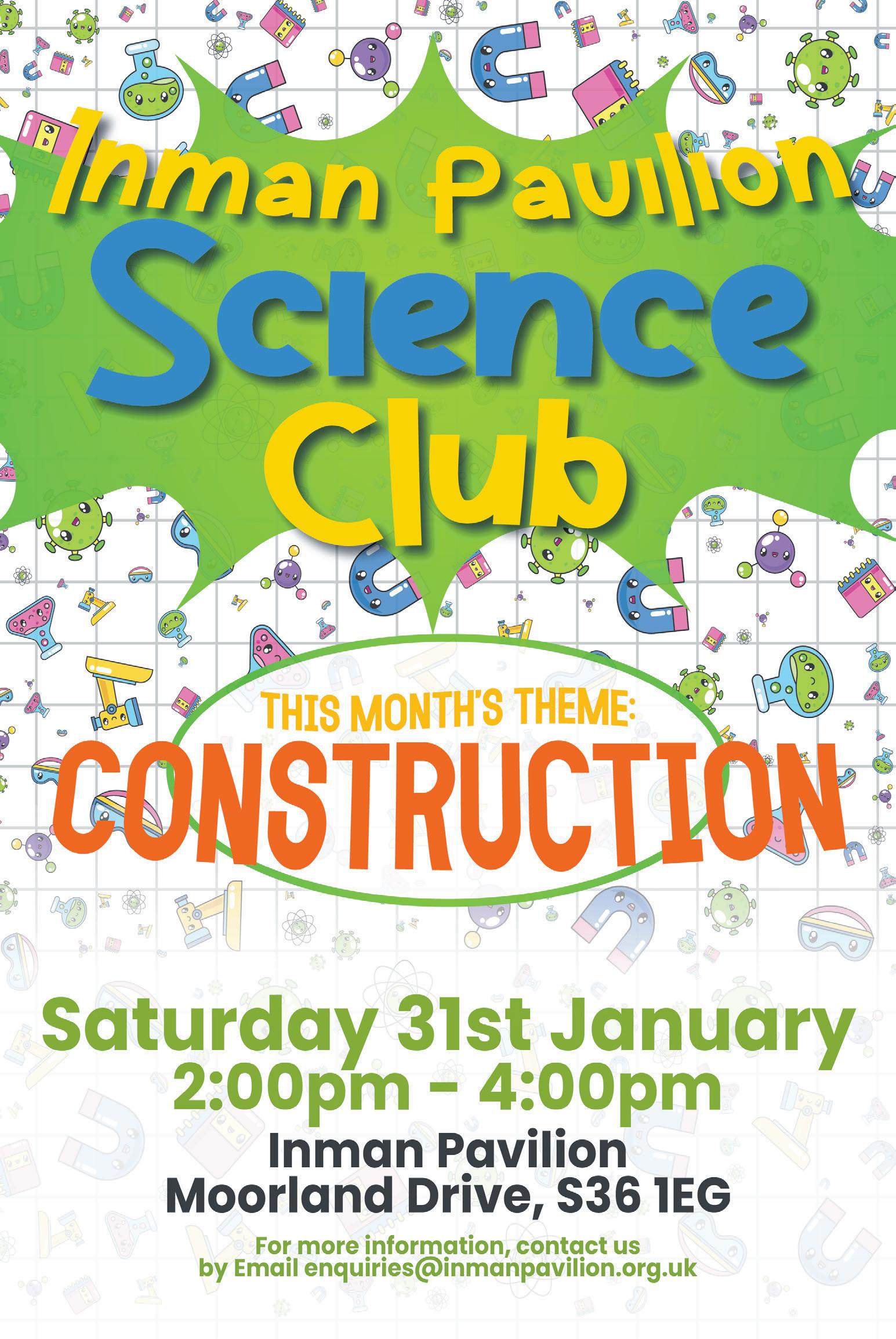 31 Science Club at the Inman Pavilion 2-4pm This months’ theme is construction, building structures out of straws and spaghetti.