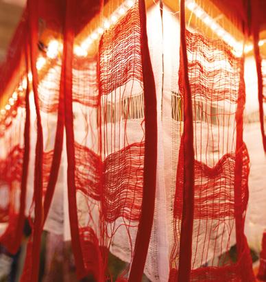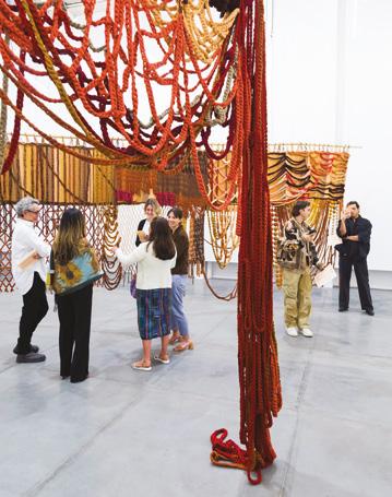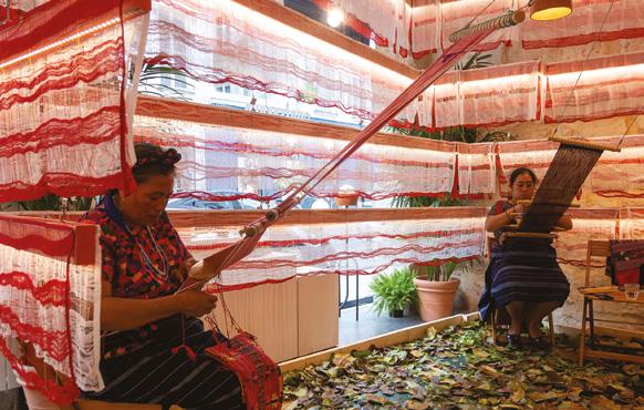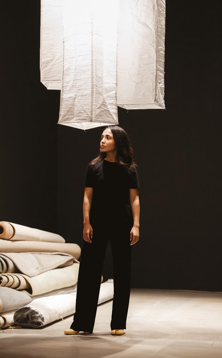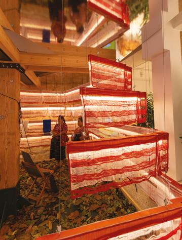 Una de las piezas centrales fue la cápsula arquitectónica inspirada en el Templo I de Tikal. Esta reinterpretación del Gran Jaguar, creada a escala y construida con materiales sostenibles, no buscó replicar la monumentalidad original, sino traducir su espíritu. La madera, los textiles y los cables tensados sostuvieron un espacio habitable que se iluminó con paisajes sonoros de la selva, los mercados y los territorios mayas. La instalación se convirtió en una experiencia sensorial, casi ritual, íntima y profundamente envolvente.