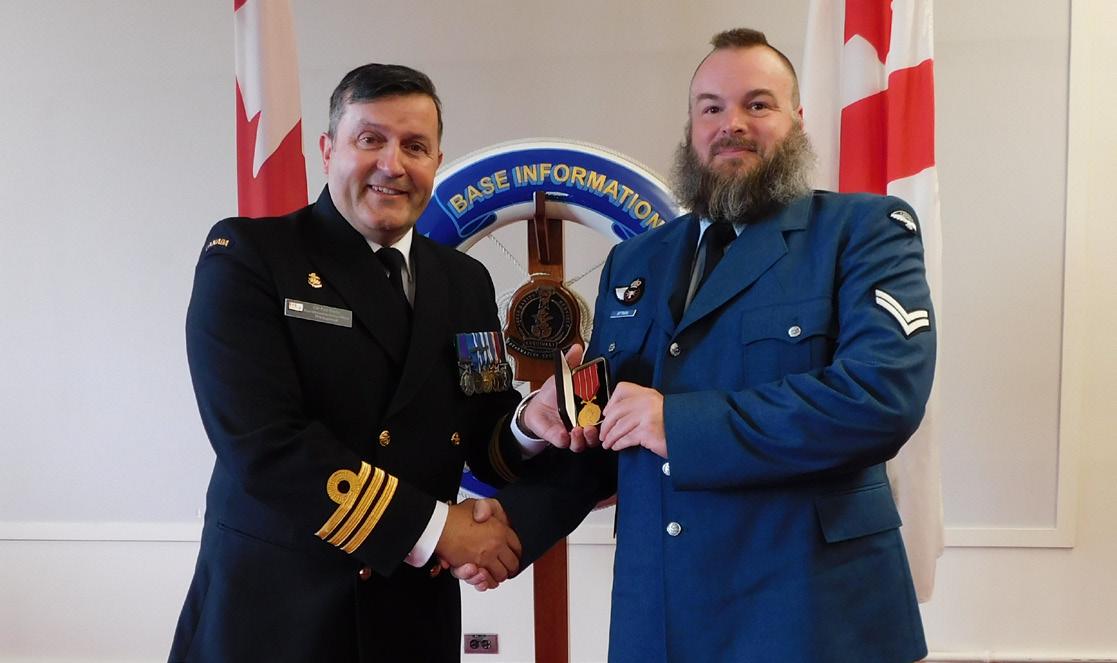 Presentation of Canadian Forces Decoration to Base Information Services. Presented by Commodore Paul Frisby on Oct. 4. Photos: Sailor Third Class Bissanthe, BIS-OR