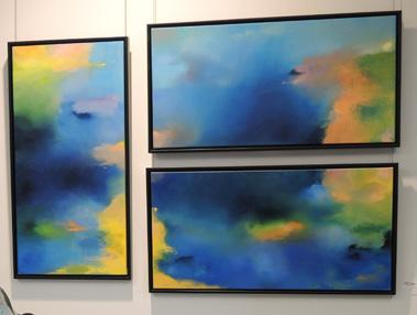 Rhapsody in Blues is her vision of a sunrise over the Strait of Juan De Fuca. She drew from a wide range of colours such as titanium white, lemon yellow, cadmium orange, perm rose, vermillion hue, primary red, alizarin crimson and Prussian blue.