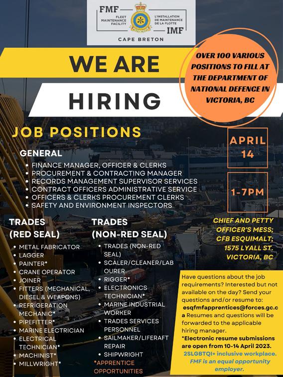 • CANADIAN MILITARY’S TRUSTED NEWS SOURCE FOR 80 YEARS • Buying or Selling? Esbati Chris I can help! Knowledgeable Trustworthy Dedicated VIEW OUR FLYER IN THIS PAPER WEEKLY! Island Owned and Operated since 1984. Coffee 6 am is ready! P: 250.384.1417 10% DISCOUNT FOR MILITARY AND VETERANS 101-1503 ADMIRALS ROAD Mon-Fri 6 am-5 pm Sat-Sun 8 am-4 pm IN ADMIRALS WALK PLAZA ACROSS FROM THRIFTY’S A full array of coffee and tea, baked goods and sandwiches! MOBILE ORDERING IS NOW AVAILABLE! Volume 6 8 Number 13 | April 3, 2023 Marine › Land › Aviation › Cavendish Nuclear › babcockcanada.com Sailor Third Class (S3) Coles and S3 Schaffer, members of His Majesty's Canadian Ship (HMCS) Winnipeg, throw lines to dock alongside HMCS Ottawa in Port Alberni on March 7. The frigates visited Port Alberni for a small rest in-between the Task Group Exercise-23. Photo: Corporal Tristan Walach, Canadian Armed Forces FRIGATES IN PORT
