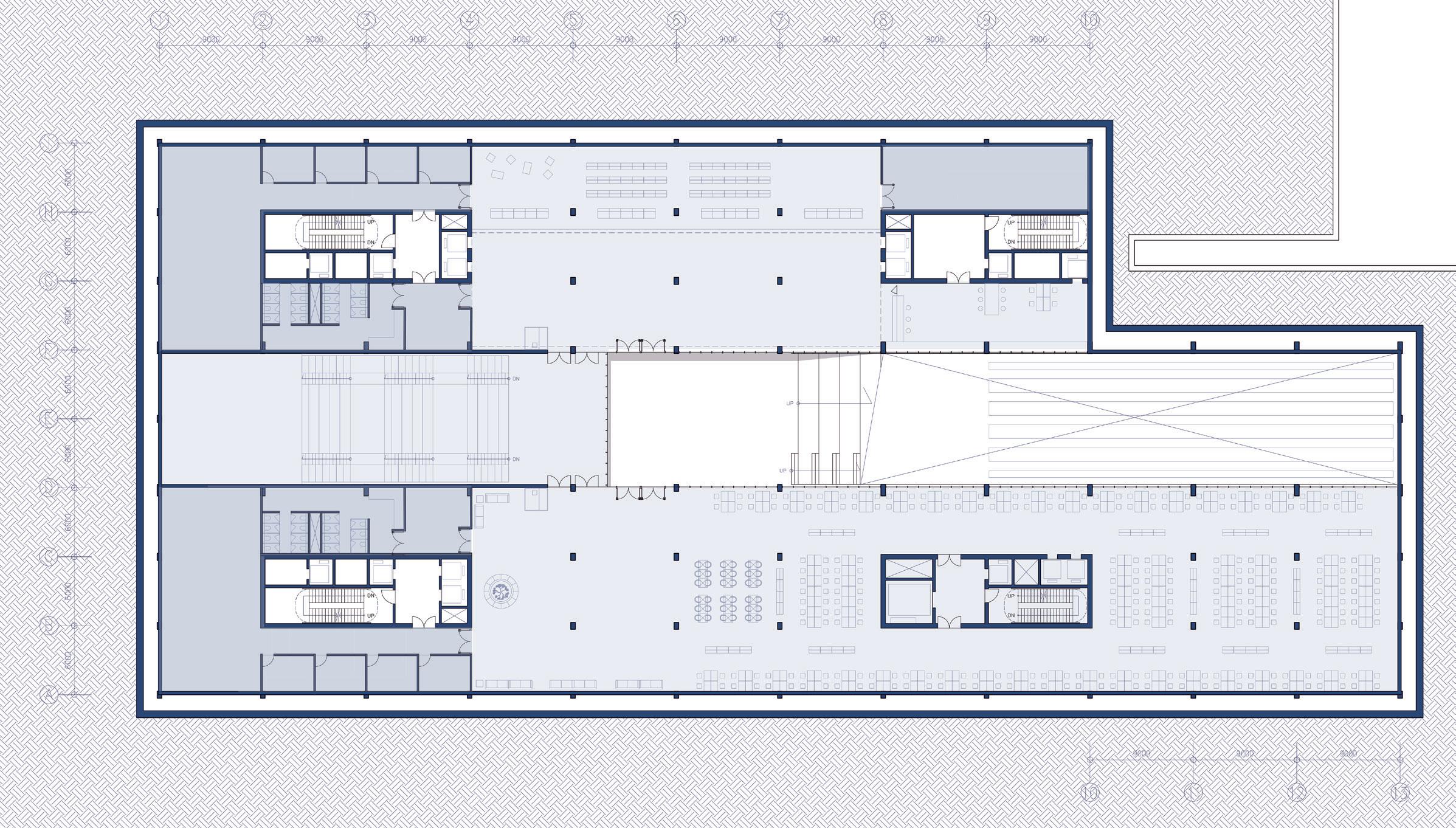 Descending from the sunken plaza, the Basement 1 floor unfolds as a vital space characterized by its distinct zones. Positioned in the northern sector, a public lobby serves as a pivotal junction, providing seamless access to the library on the second floor via four dedicated public elevators. This strategic layout ensures efficient vertical circulation for visitors.