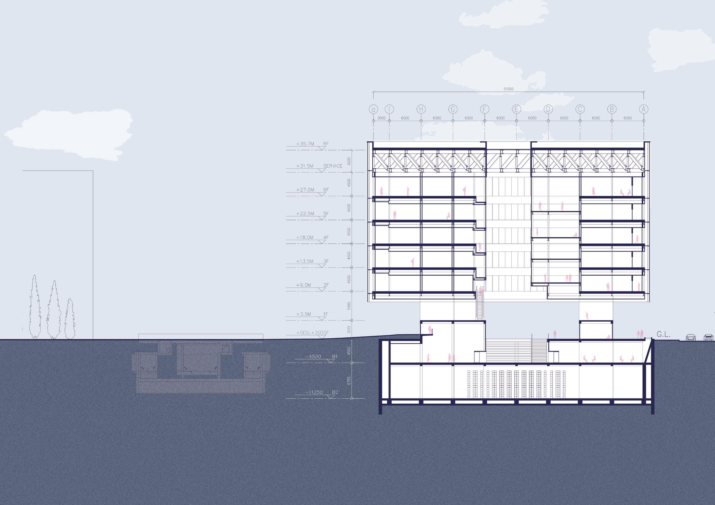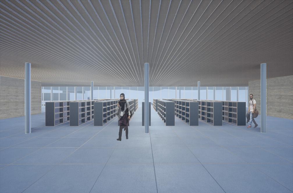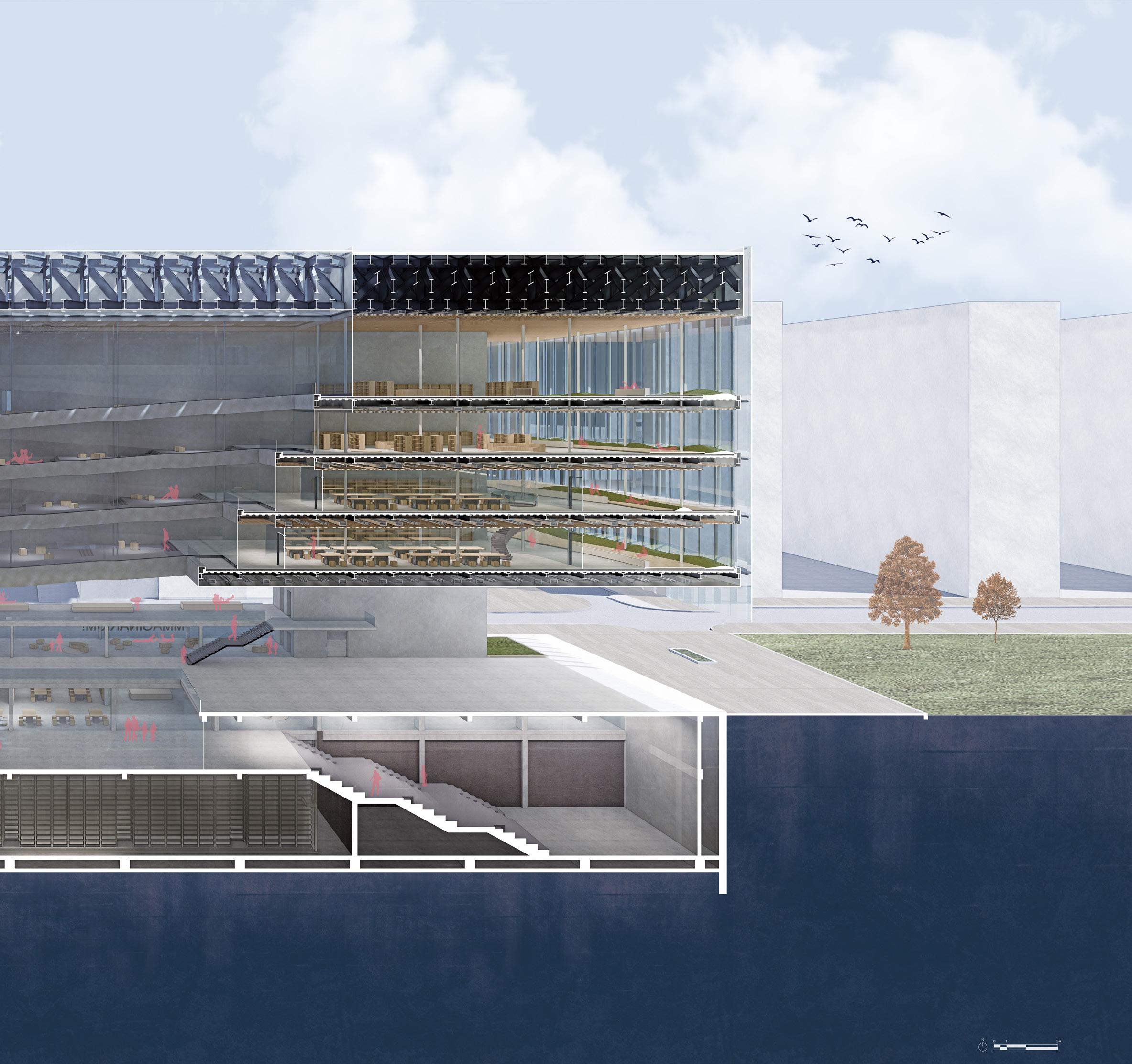 The longitudinal section of the library highlights the visual connection of public groundfloor. Also, the tilted void allows the light to come into library reading areas.