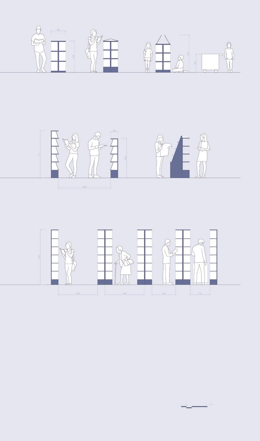 We have adhered to research and standards to adhere to the right anthropometrical values while selecting shelves for accessibility. In the northern region, where light is welcome and the quality is better than on the contrary side, we placed tall shelves to utilize space efficiently and react to the façade dimensions and characteristics.