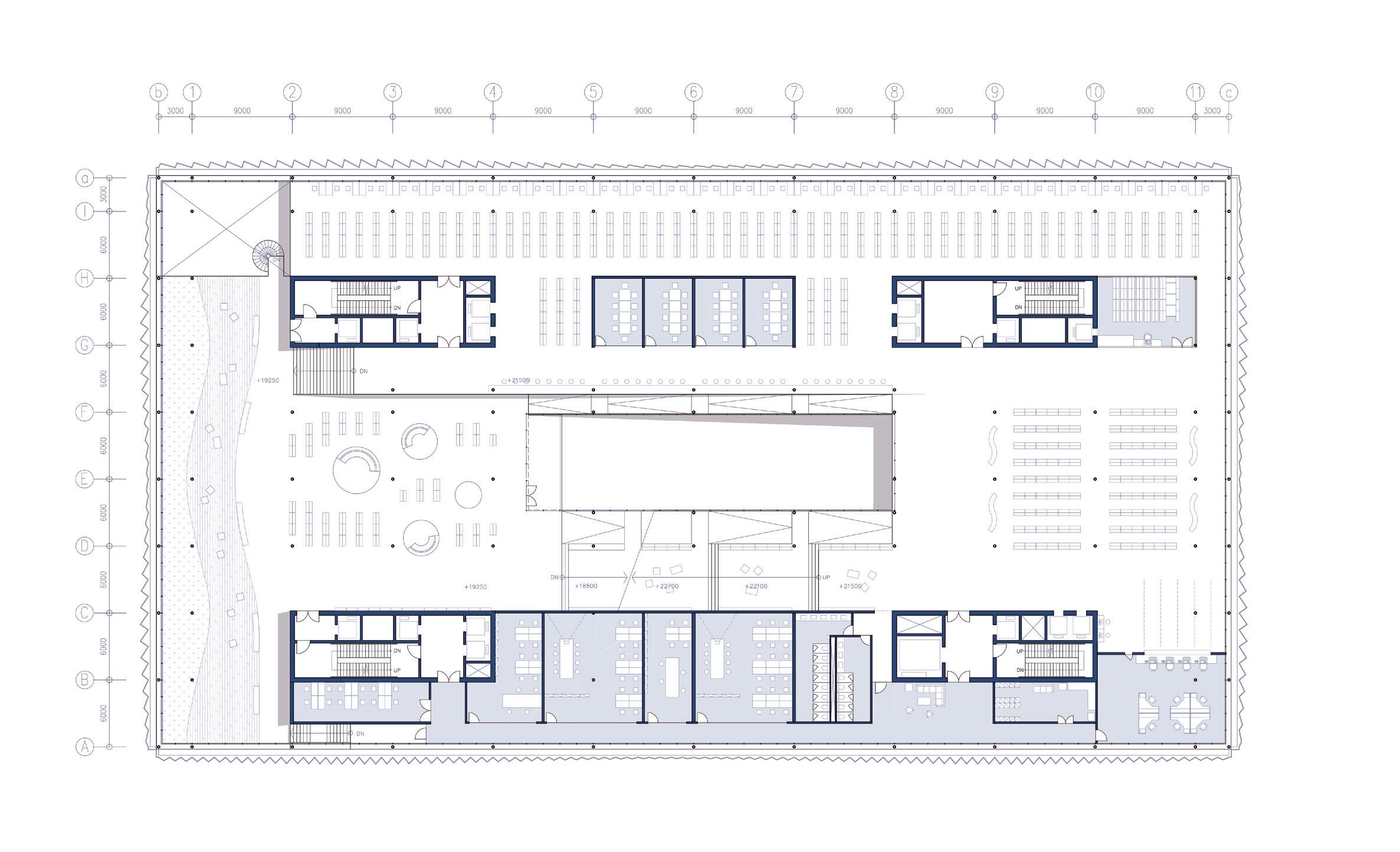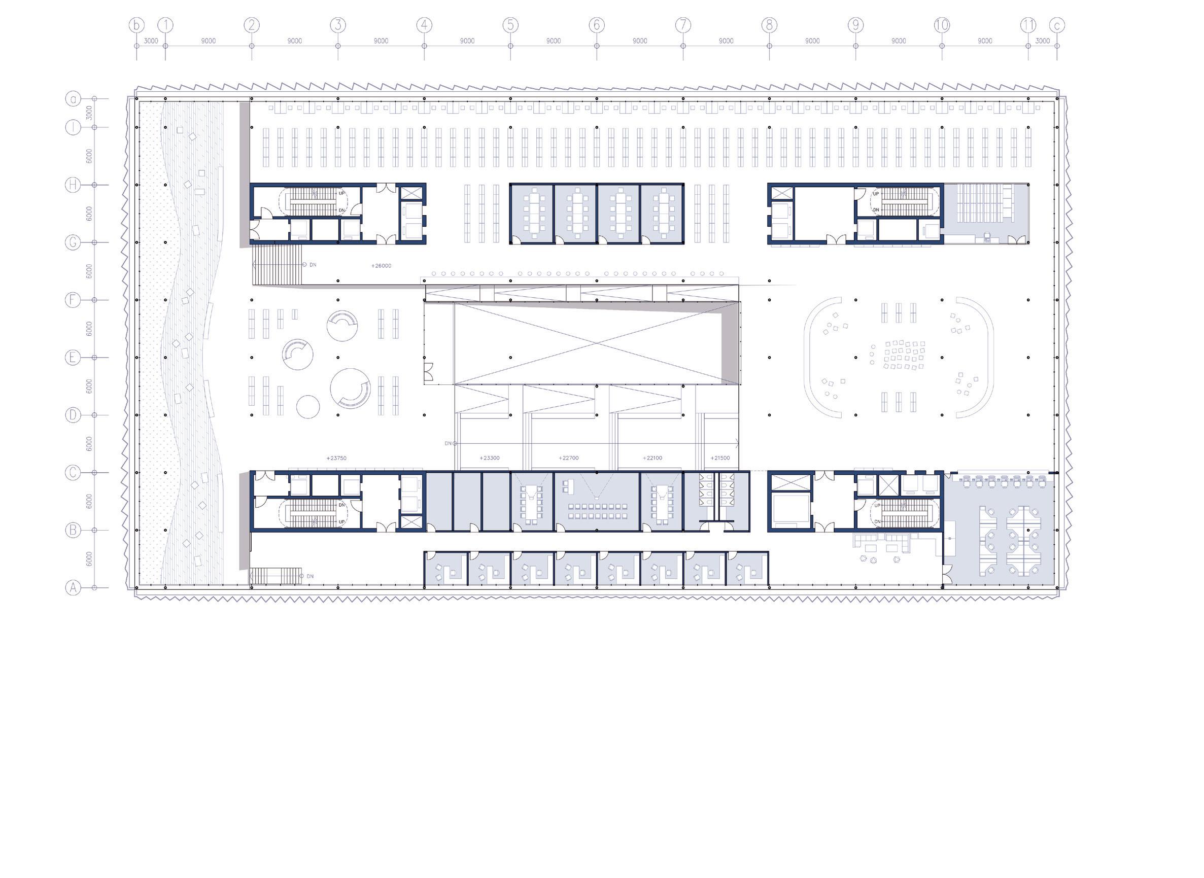 A focal point emerges on the western extremity of this floor, where a split floor arrangement has an evocative artificial landscape. This inclusion of reading mounds invites a playful engagement with the act of reading, while the provision of silent booths and carefully curated reading furniture caters to those seeking an ambiance conducive to contemplation and concentration.