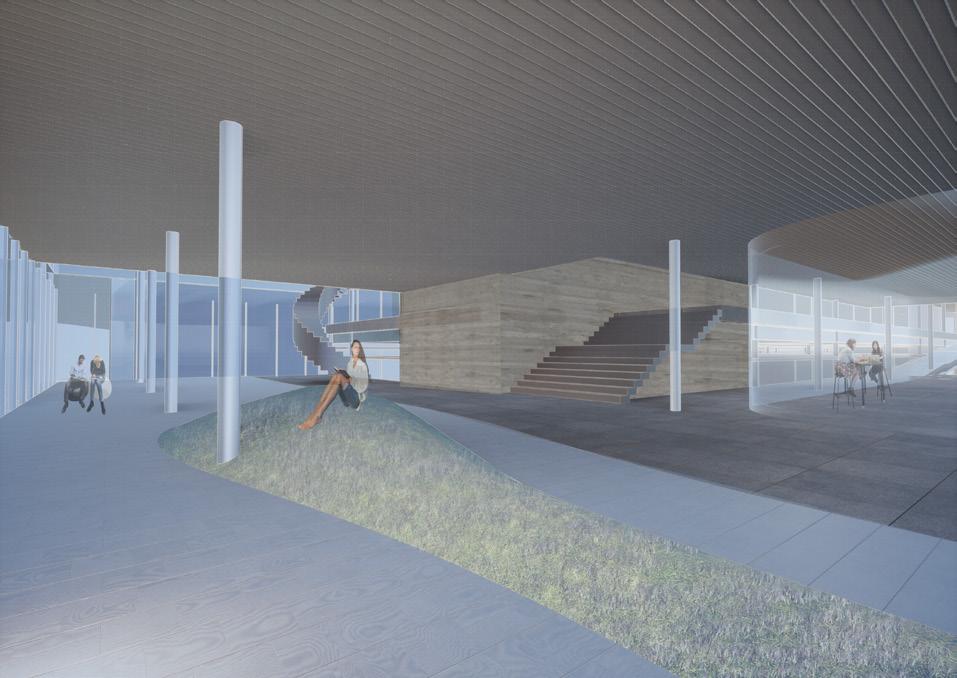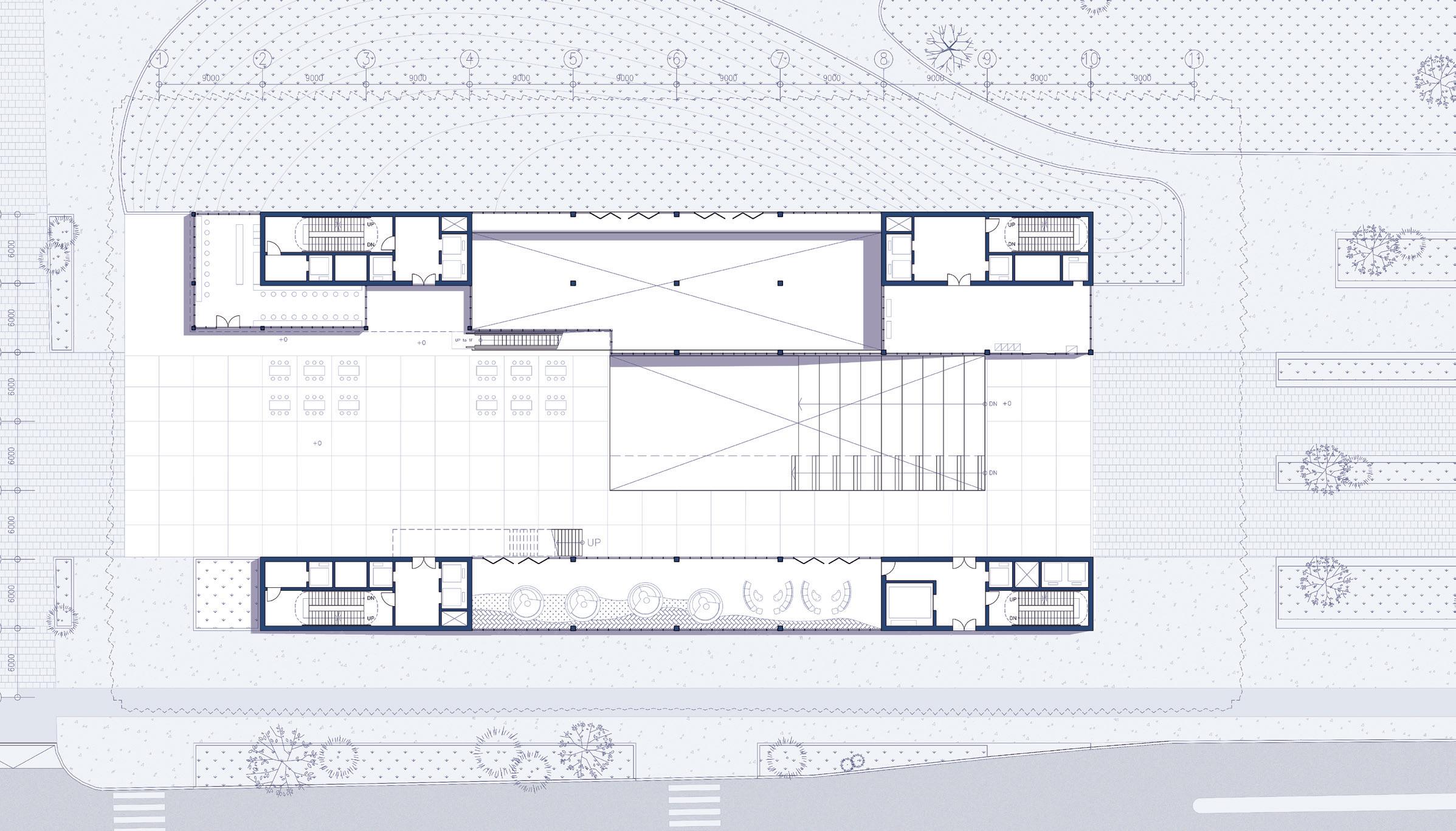 The integration of the landscape on the northern side seamlessly extends into the building through the incorporation of a mezzanine floor within the ground level. This design decision reduces any distinction between the natural and artificial elements within the building environment and generates a compelling synergy between the interior and outdoor realms.
