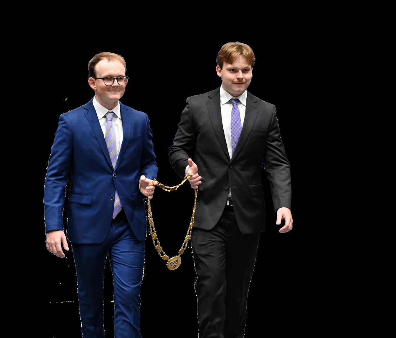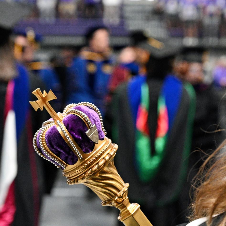 The presidential regalia embodies the dignity of the office and academic distinction. The robe, with velvet panels and sleeve bars, reflects the honor of the doctoral degree. Trimmed in purple, the traditional color of the law, signifies the president’s Juris Doctor and lifelong commitment to justice and scholarship.