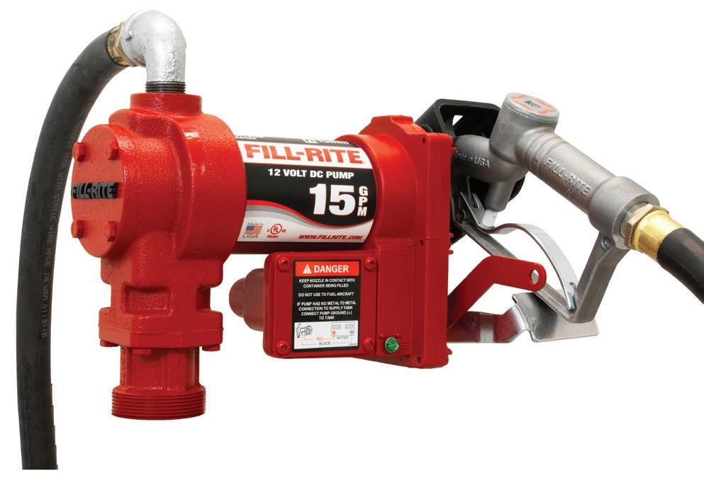 Includes pump, 1” manual nozzle, 1” x 12” hose with static ground wire, 18’ battery cable, and 20”-34” steel telescoping suction pipe