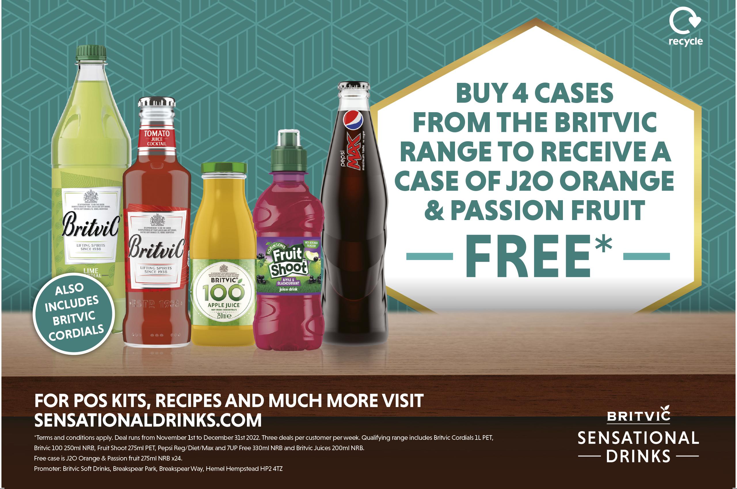 Tate Smith T’s & C’s: Deal runs from 1st November to 31st December 2022. Qualifying range includes Britvic Mixers 200ml NRB and Pepsi Reg/Diet/Max 200ml NRB. Free case is Britvic tonic or low cal tonic 200ml NRB x24. Promoter: Britvic Soft Drinks, Breakspear Park, Breakspear Way, Hemel Hempstead HP2 4TZ SCAN THE QR CODE FOR MORE SERVE AND RECIPE INSPIRATION