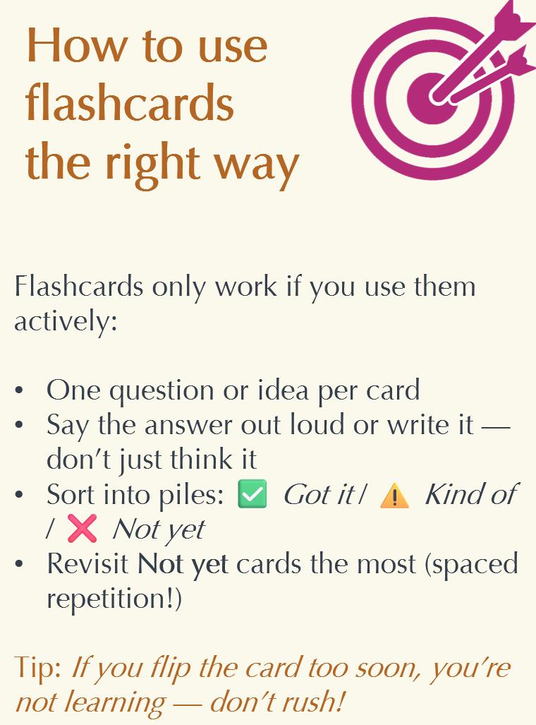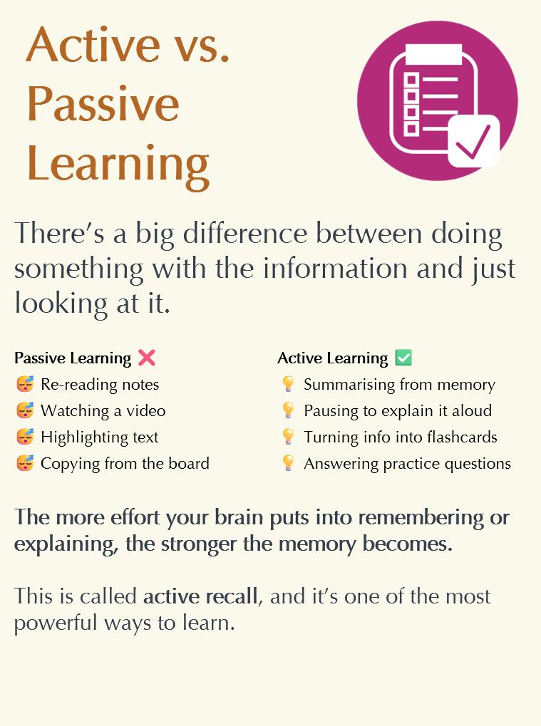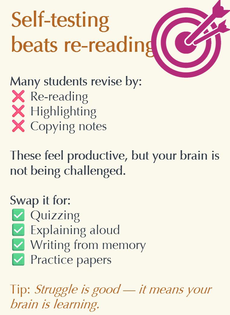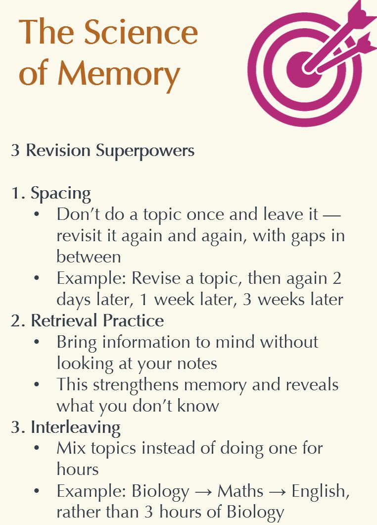 • Revise little and often (spaced repetition) – don’t do hours a day because it is unnecessary, and you’ll burn yourself out.