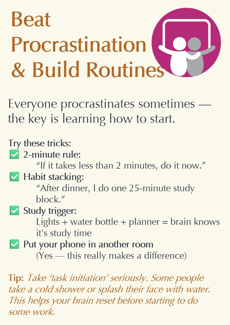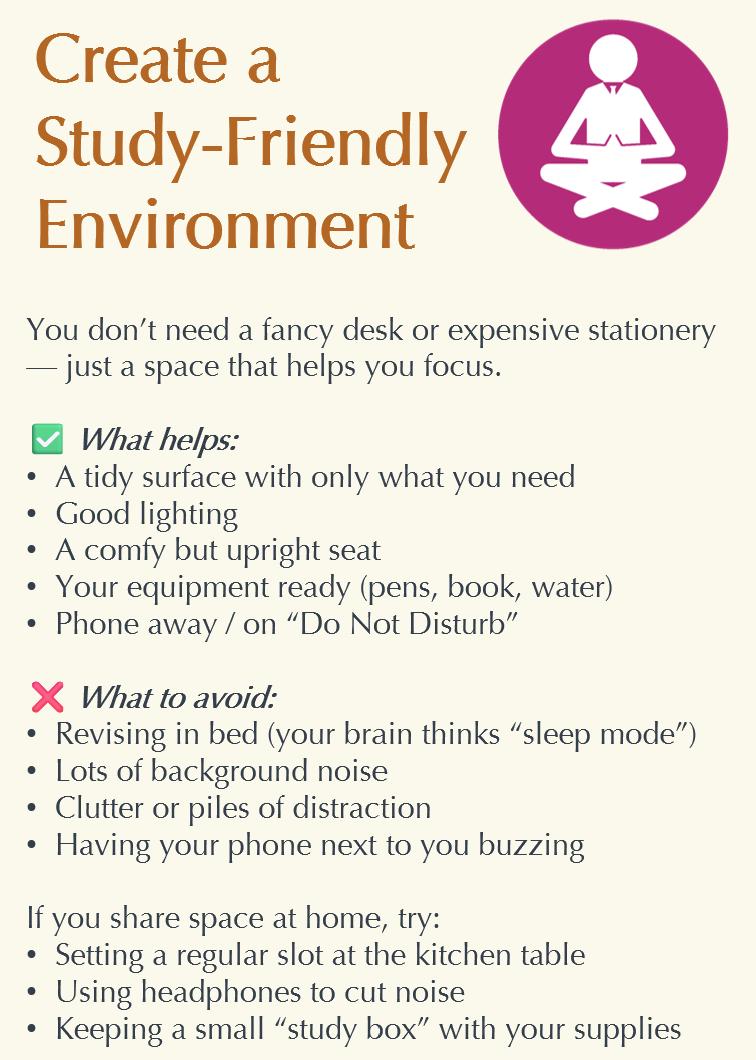 • Make your working space like your exam desk. Have on it only the resources you need to complete the work. And that means no phones. And that means no music either.