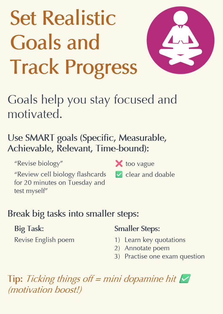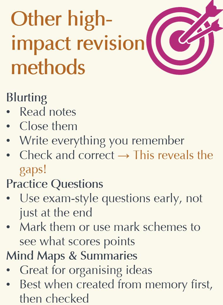 • Most importantly, don’t revise the subject you like the best / are the best at, focus on your weaker subjects and topics/exam skills that you struggle with most.