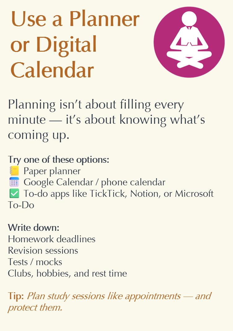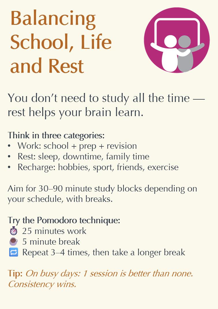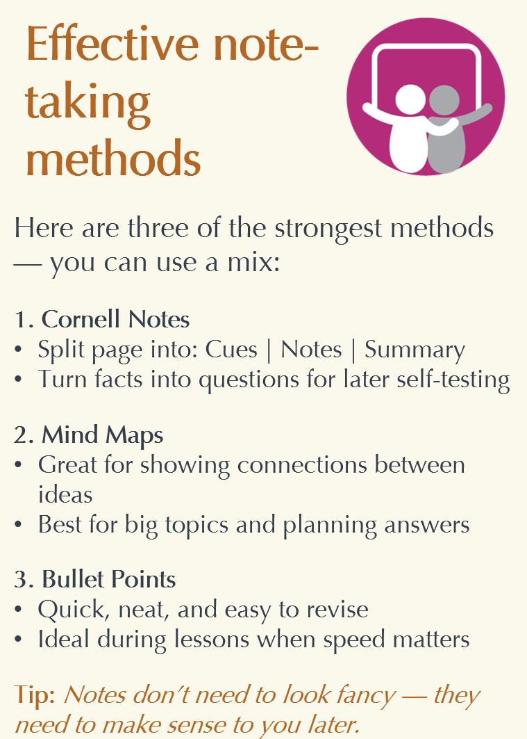 • 5th form mocks and the real GCSEs come around so quickly, so try to revise as you go along (especially in half terms and holidays) . However, also make sure you allocate time for relaxing - balance is key.