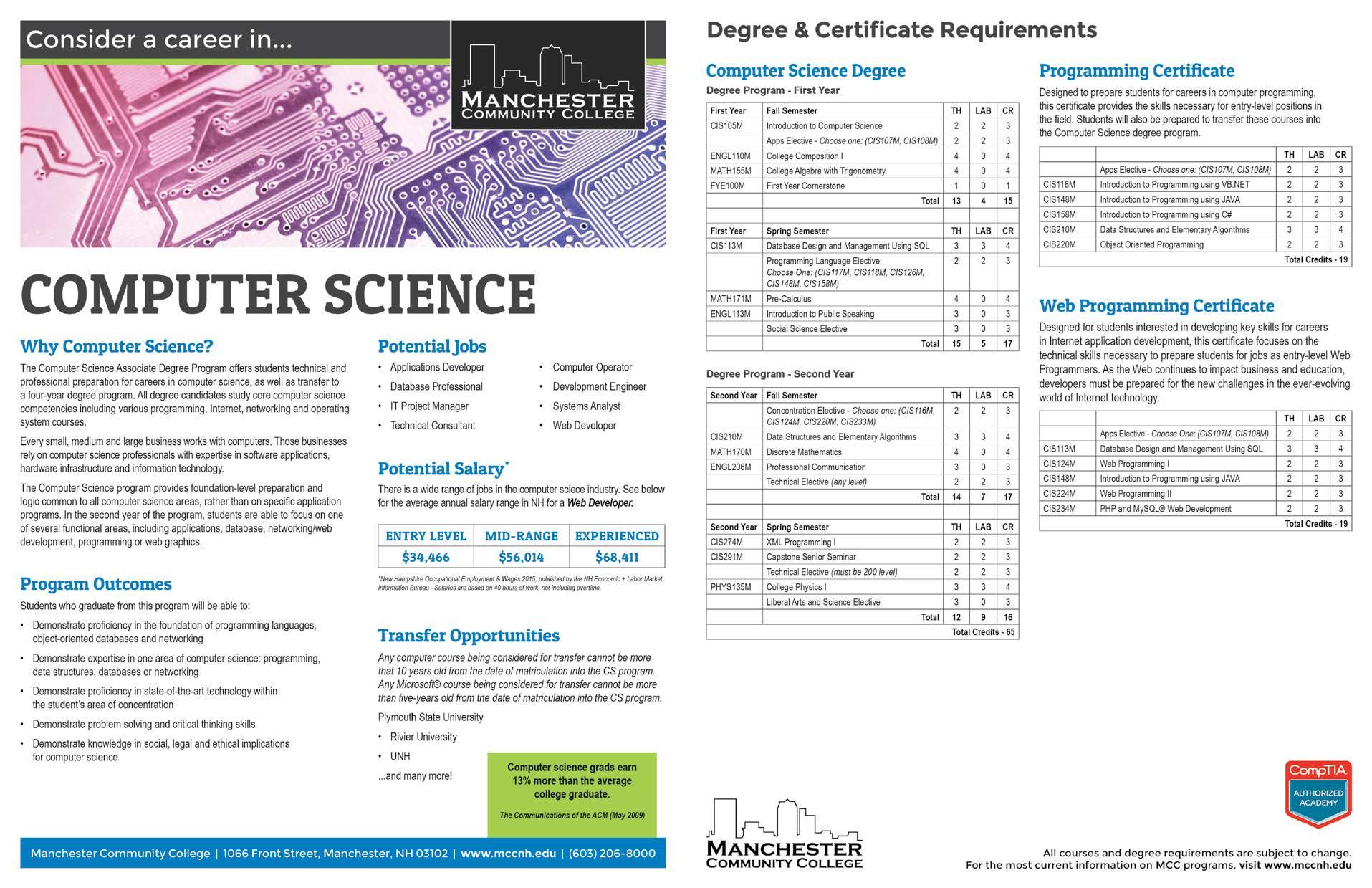 Manchester Community College is a fully accredited comprehensive community college offering associate degrees and certificates in more than 60 degree and certificate programs, including art and design, automotive technology, business, construction technologies, education, healthcare and liberal arts.
