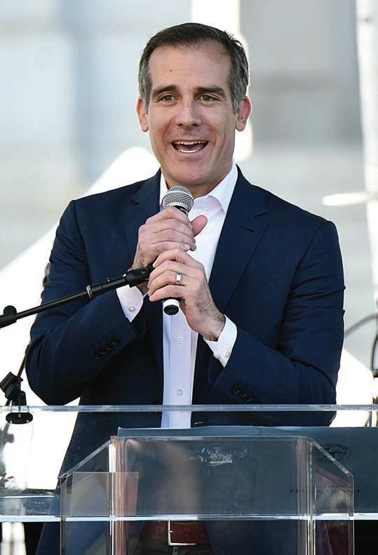 LA Mayor Eric Garcetti, a leader in the “sanctuary cities” movement, gave a spirited speech that included a personal nod as a lieutenant in the U.S. Navy Reserve toward the city’s transgender community.