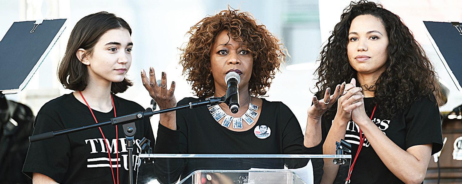 (L-R) Rowan Blanchard, Alfre Woodard and Jurnee Smollett-Bell speak onstage at 2018 Women’s March Los Angeles at Pershing Square on January 20