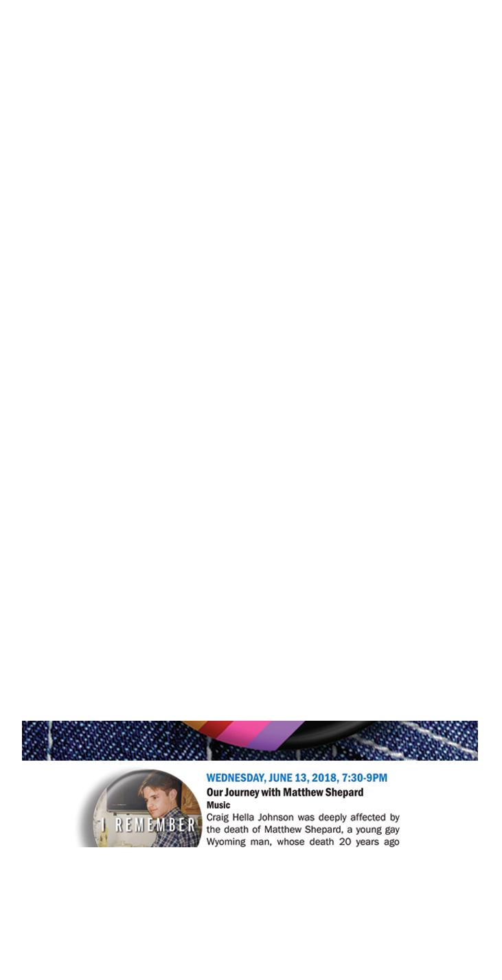 One City One Pride: Our Journey with Matthew Shepard, Craig Hella Johnson was so deeply moved and affected by the death of a young gay Wyoming man in 1998, Matthew Shepard that he wrote was has become a Grammy-nominated Masterwork. Join Johnson and members of the Conspirare choir for a sneak peak. The events surrounding his death 20 years ago created an enormous worldwide outpouring of grief and sense of injustice that continues to reverberate today. Presented in partnership with the Ford Theatres, where the work is being presented in its entirety on June 15 and 16 at 8:30 PM, and Chris Isaacson Presents. Visit Weho.org/pride for more information.
