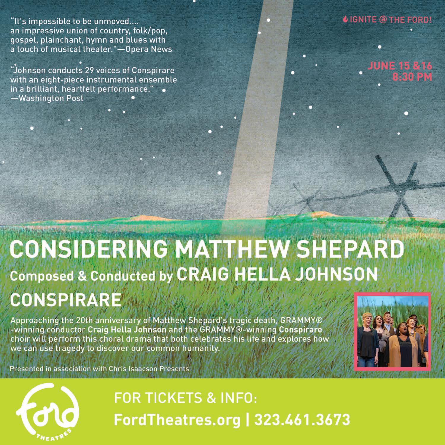 One such work is “Considering Matthew Shepard,” an oratorio composed by renowned composer/conductor Craig Hella Johnson –who will lead his Grammy-winning choir, Conspirare (along with a small instrumental ensemble and projected imagery), in a performance of this acclaimed piece at the Ford Theatre on June 15 and 16.